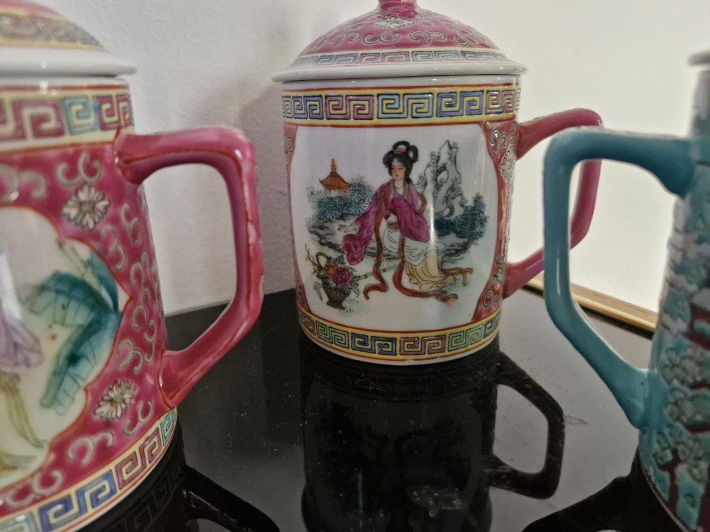 Krásné porcelánové hrníčky s tradičními čínskými motivy. Dva jsou v top stavu, třetí má na vnitřní hraně vršku oťuk- nafoceno. Cena je za 3 kusy.