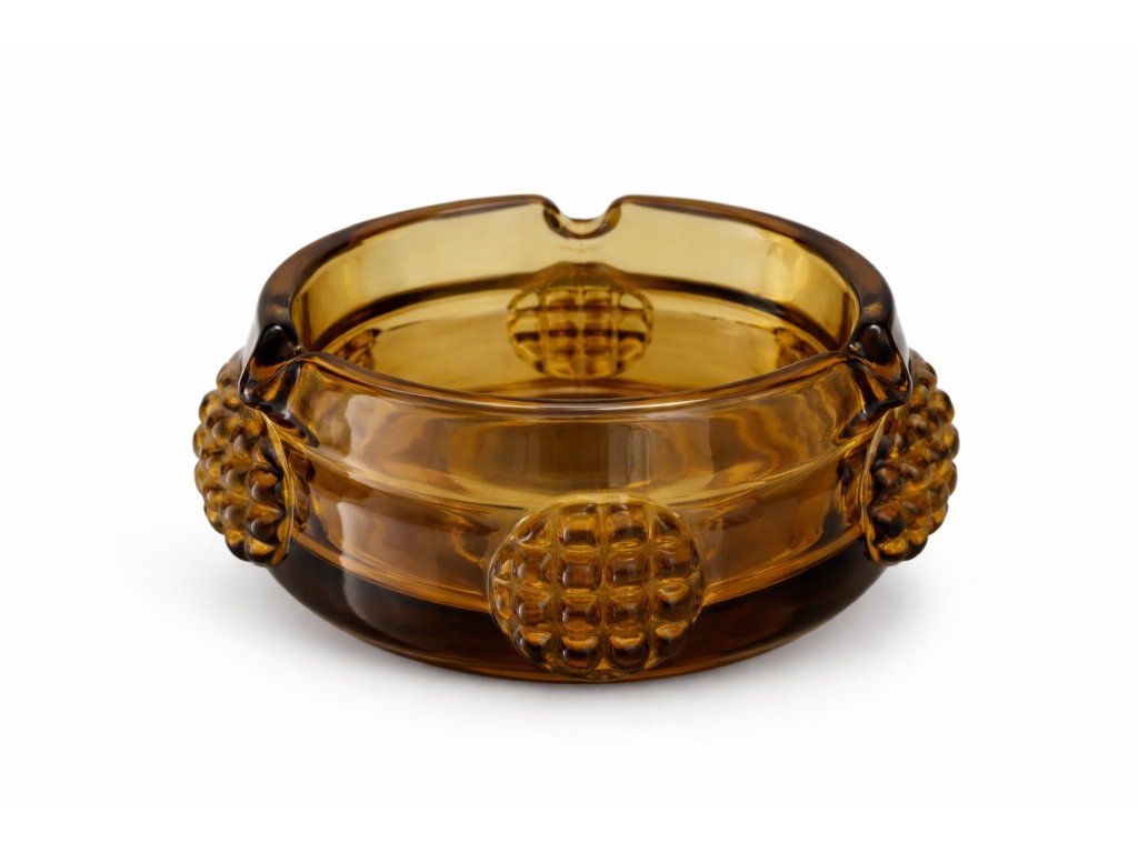 Krásná ambrová mísa (původně velký popelník) z hutního skla s nálepy dle autorského návrhu Josefa Hospodky, sklárna Borské sklo - Prácheň, 60. líta 20. století. Výška 9 cm, průměr 15 cm. Top stav.