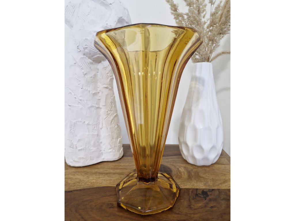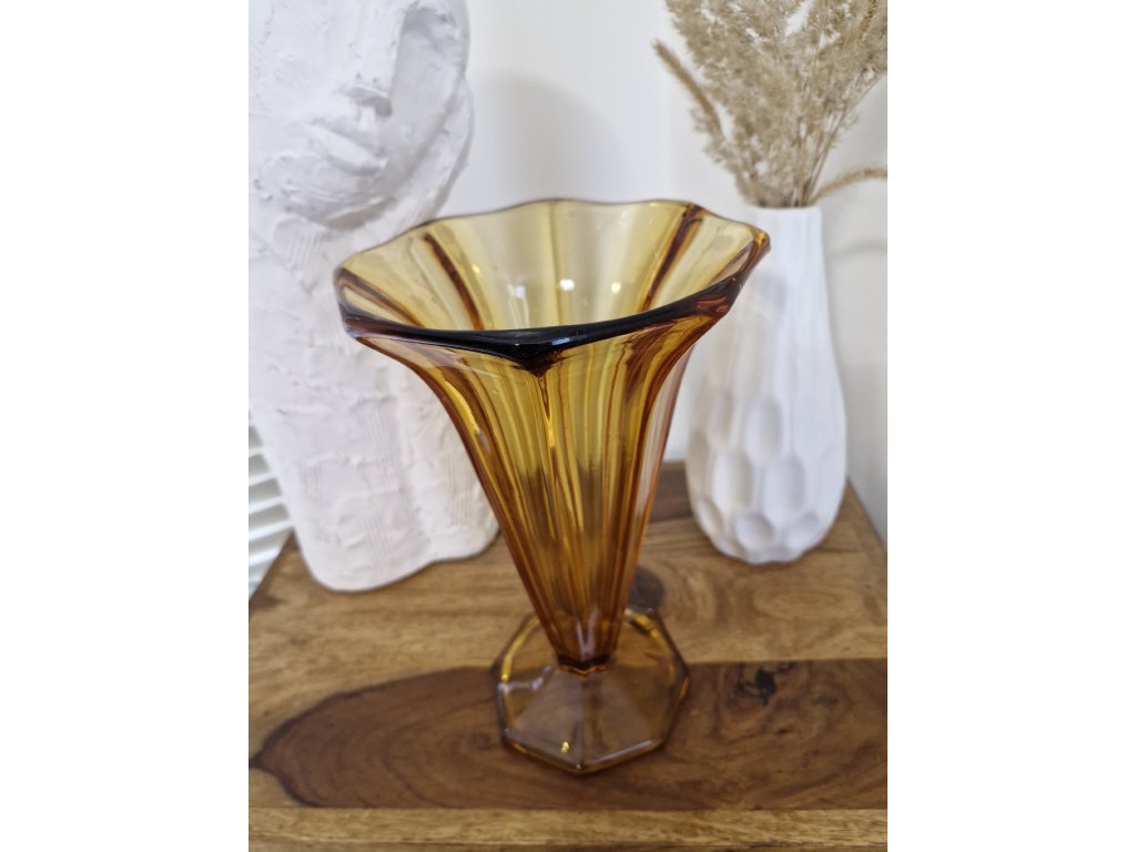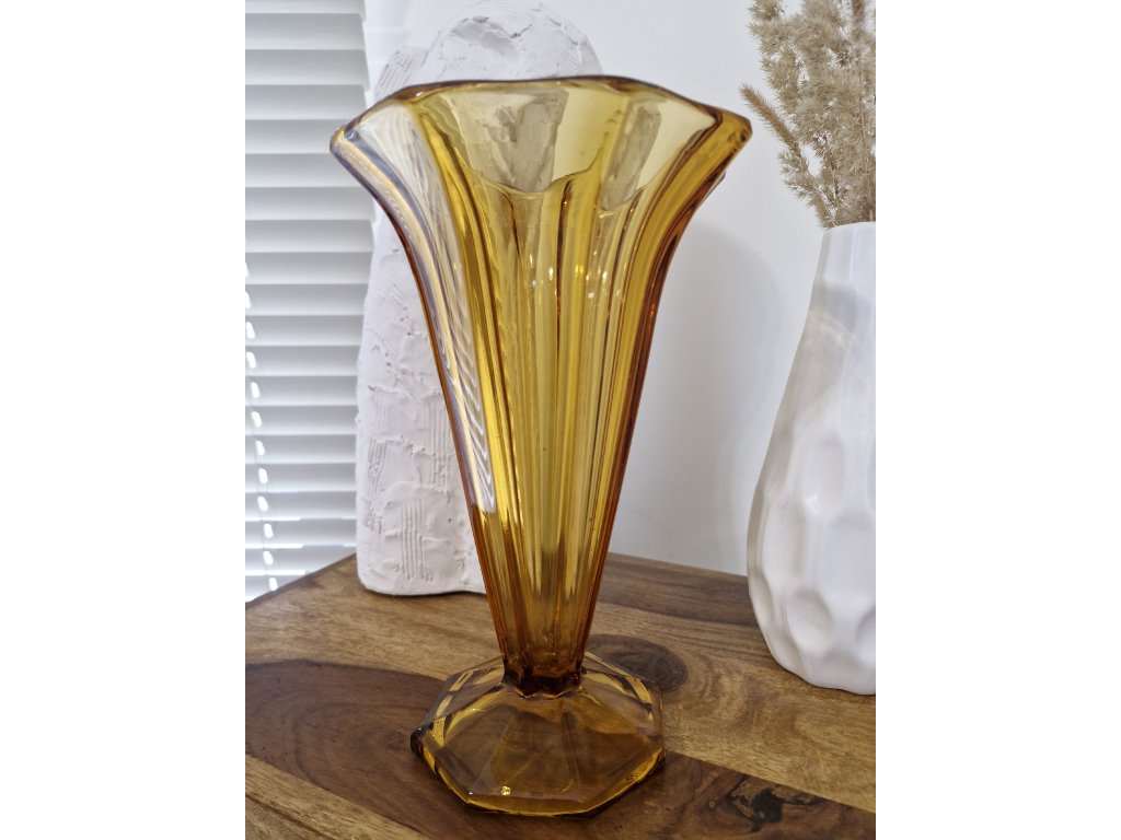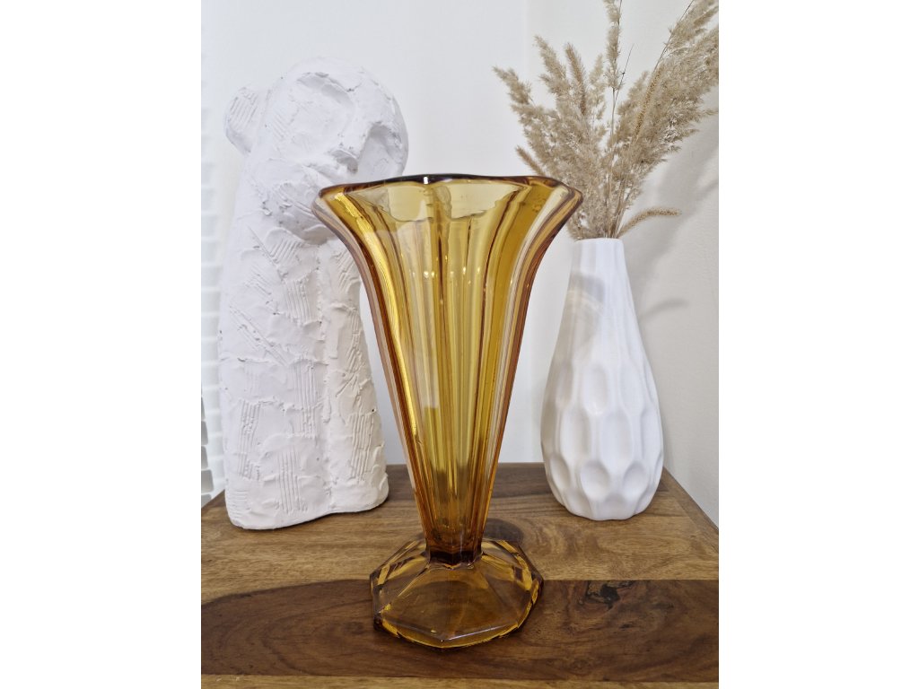 Krásná ambrová váza z lisovaného skla ve stylu Art Deco. Z produkce sklárny Heřmanova huť, 50. léta 20. století. Výška 26 cm. Top stav.