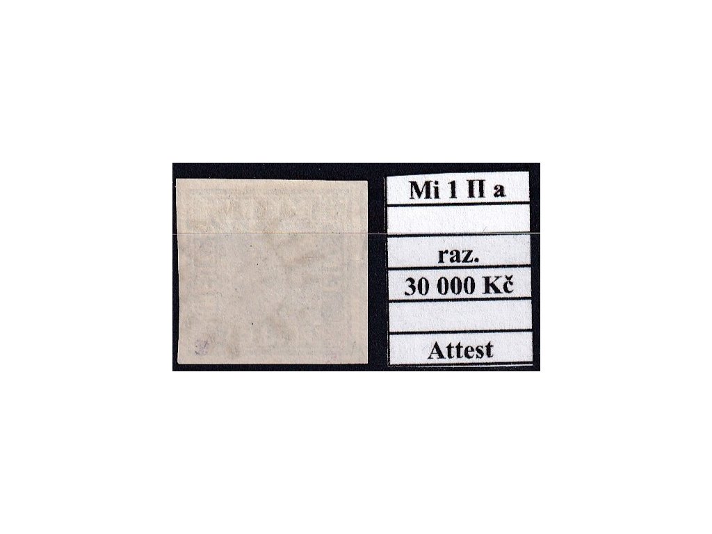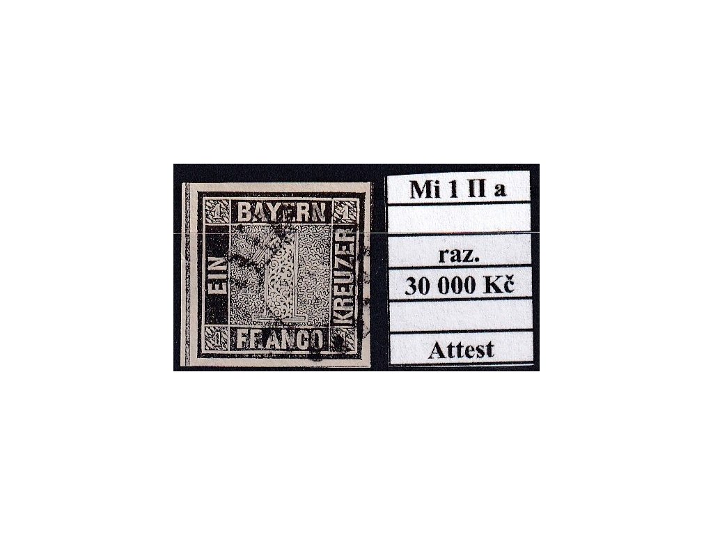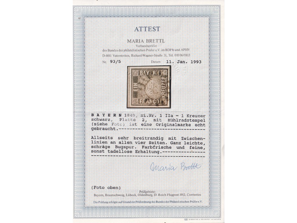 Legendární Schwarzer Einser, první známka Bavorska a první známka vydaná v Německu. Attest Maria Brettl. Známka má široké okraje s dělícími liniemi viditelnými na všech čtyřech stranách. Kromě malé trhlinky nezasahující do obrazu známky bezvadný stav.