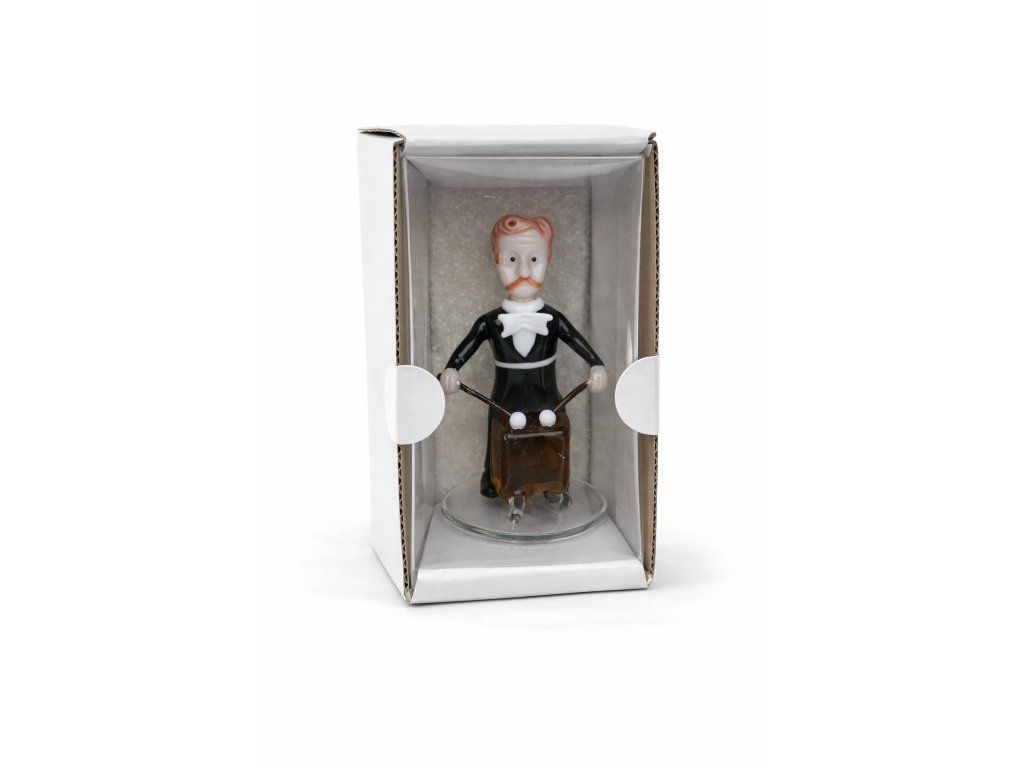 Skleněná figurka hudebníka - bubeníka. Velmi jemná v detailech, barevné sklo hutně tvarované nad plamenem. Autorský návrh prof. Jaroslav Brychta, sklárna ŽBS, 60. léta 20. století. Výška figurky cca 9 cm. Figurka je v top sběratelském stavu v originální krabičce, která nebyla nikdy otevřená.