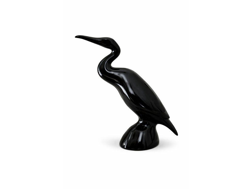 Krásná černá volavka z glazované keramiky dle autorského návrhu Miroslava Smutného, Jihokera Bechyně, 60. léta 20. století. Čistý bruselský styl. Výška 20 cm, délka 20 cm. 100% TOP stav.