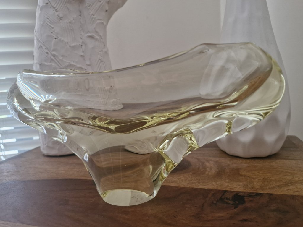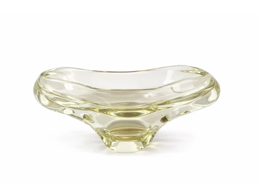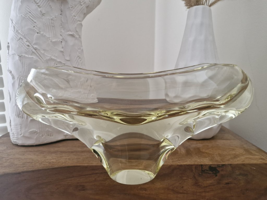 Krásná citrínová žardinka z hutního skla dle autorského návrhu Miloslava Klingera, sklárna ŽBS, 60. léta 20. století. Výška 14 cm, délka 27 cm. Top stav.