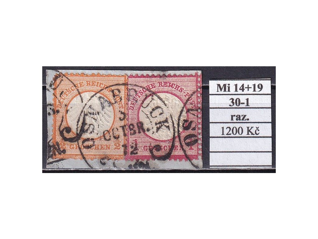 Deutsches Reich Mi 14 + 19 na výstrižku razítkované. Smíšená frankatura známek s malým a velkým štítem, navíc dekorativní razítko Osnabruck (Spalink 30-1).