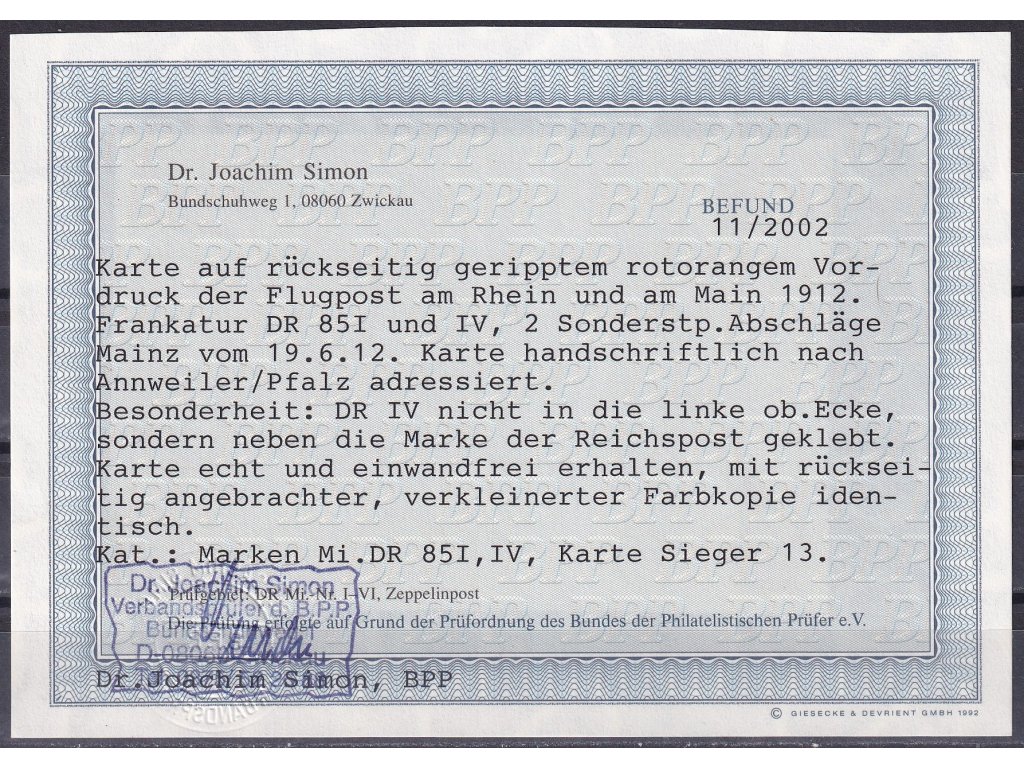 Deutsches Reich Mi IV dopisnice Befund