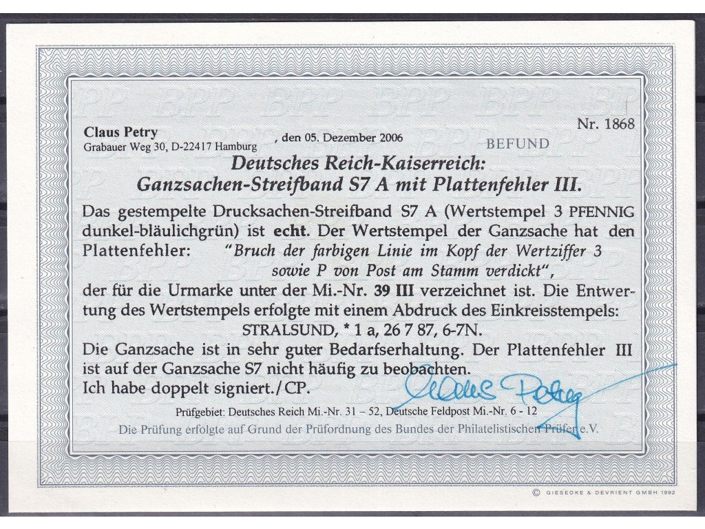 Deutsches Reich Mi S 7 A PFIII KB celina