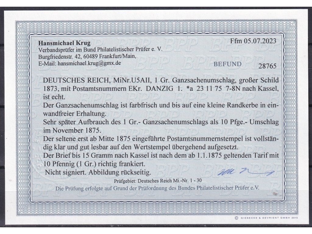 Deutsches Reich Mi U 5 A II celina Befund