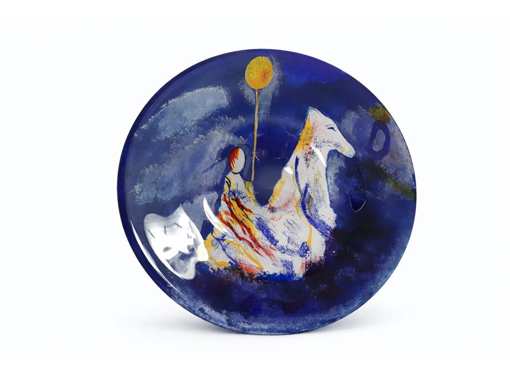 Parádní dizajnový talíř z produkce sklárny PRINC, Žďár nad Sázavou, ručně malovaný pardubickou výtvarnicí Darjou Čejkovou.
