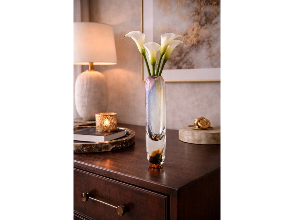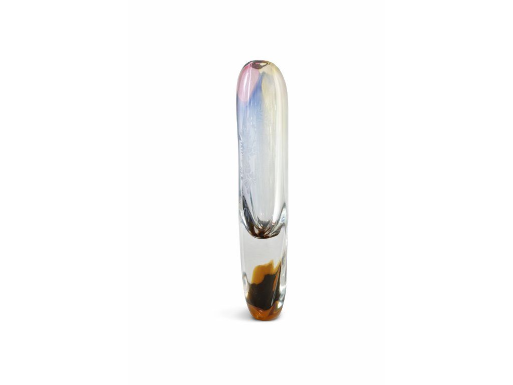 Krásná duhová váza z hutního skla s elegantní jemnou rytinou květů. Autor návrhu Josef Rozínek, sklárna ŽBS, 60. léta 20. století. Výška 29 cm. 100% TOP stav.