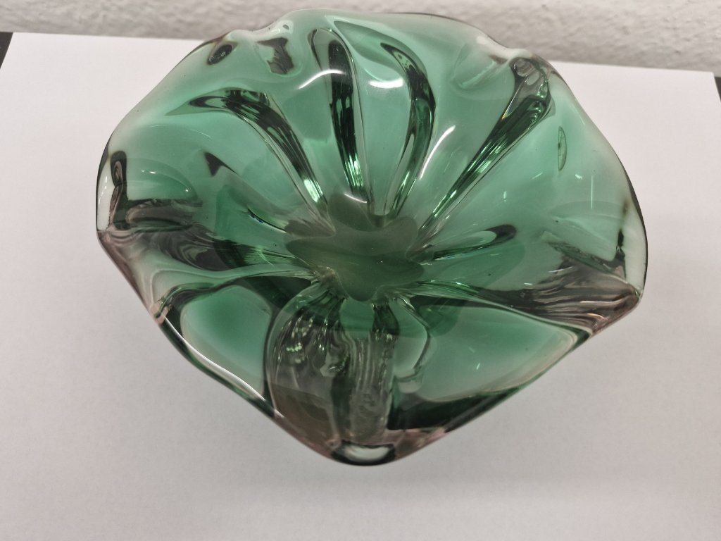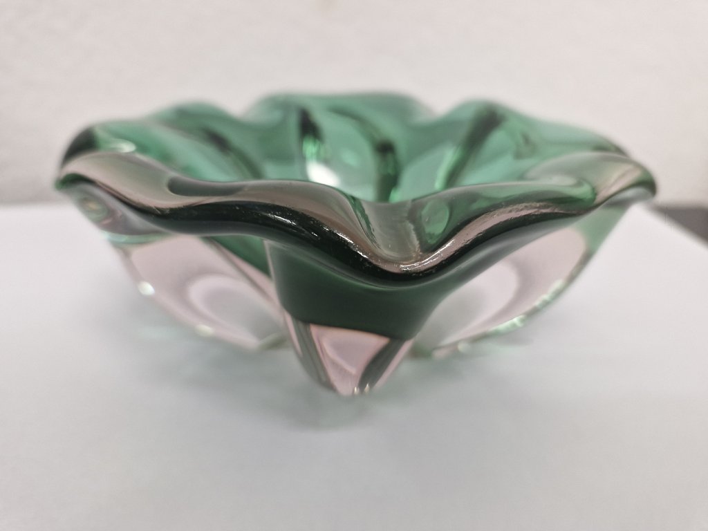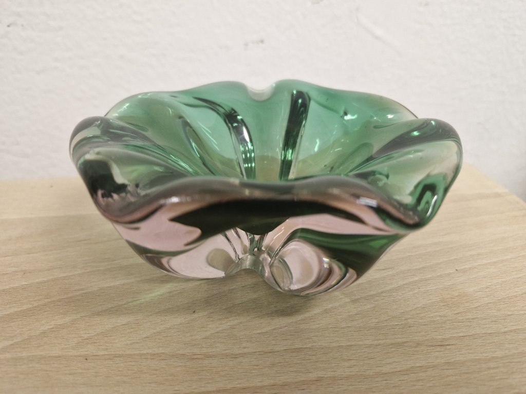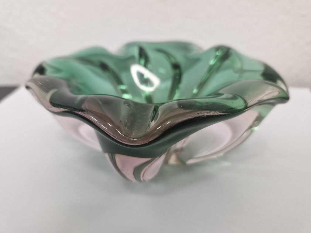 Krásná miska z hutního skla v kombinaci jemně růžové a zelené barvy. Autor návrhu Josef Hospodka, sklárna Chřibská, 60. léta 20. století. Výška 5 cm, průměr 14 cm. Top stav.