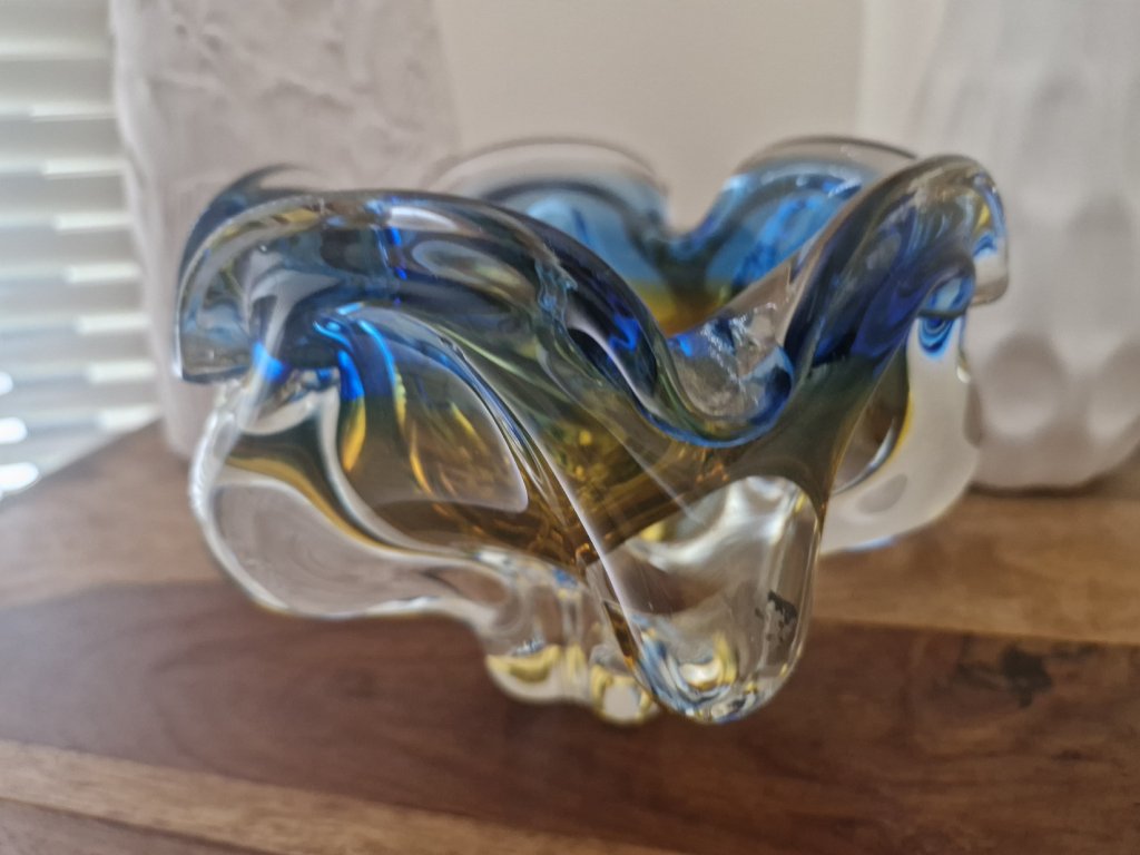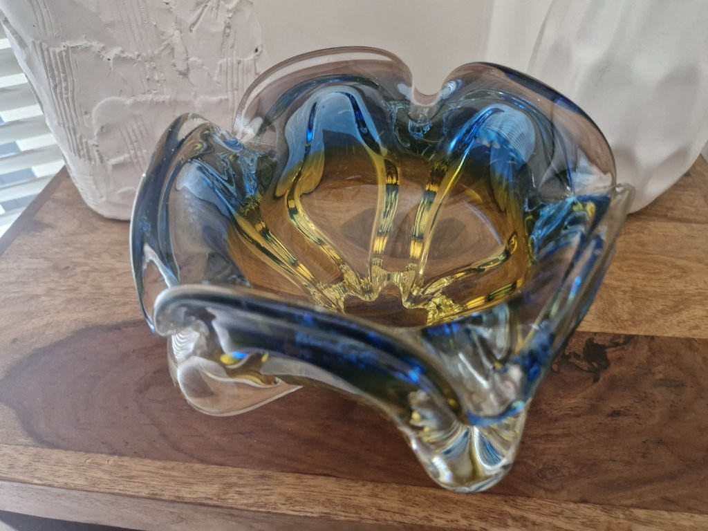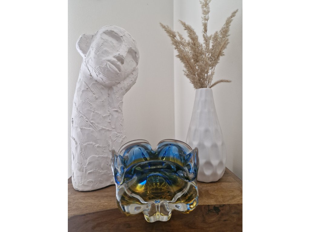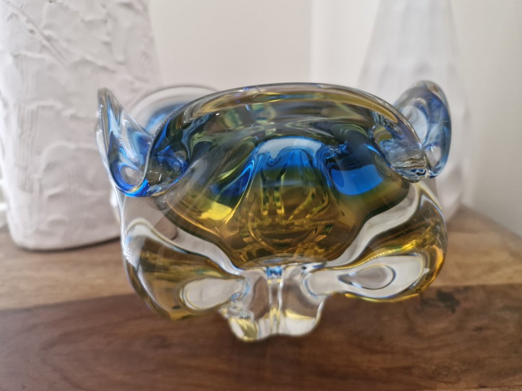 Krásná modro - žlutá žardinka z hutního skla. Autor návrhu Josef Hospodka, sklárna Chřibská, 60. léta 20. století. Výška 13 cm, průměr 18 cm. Top stav.