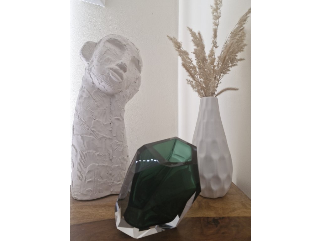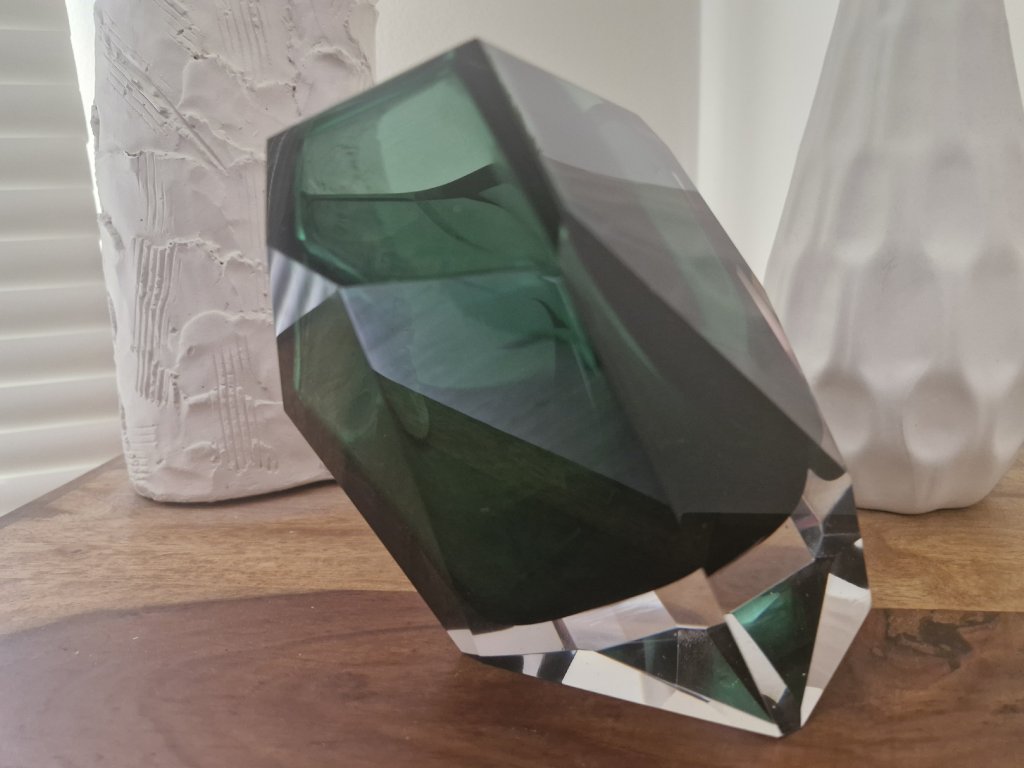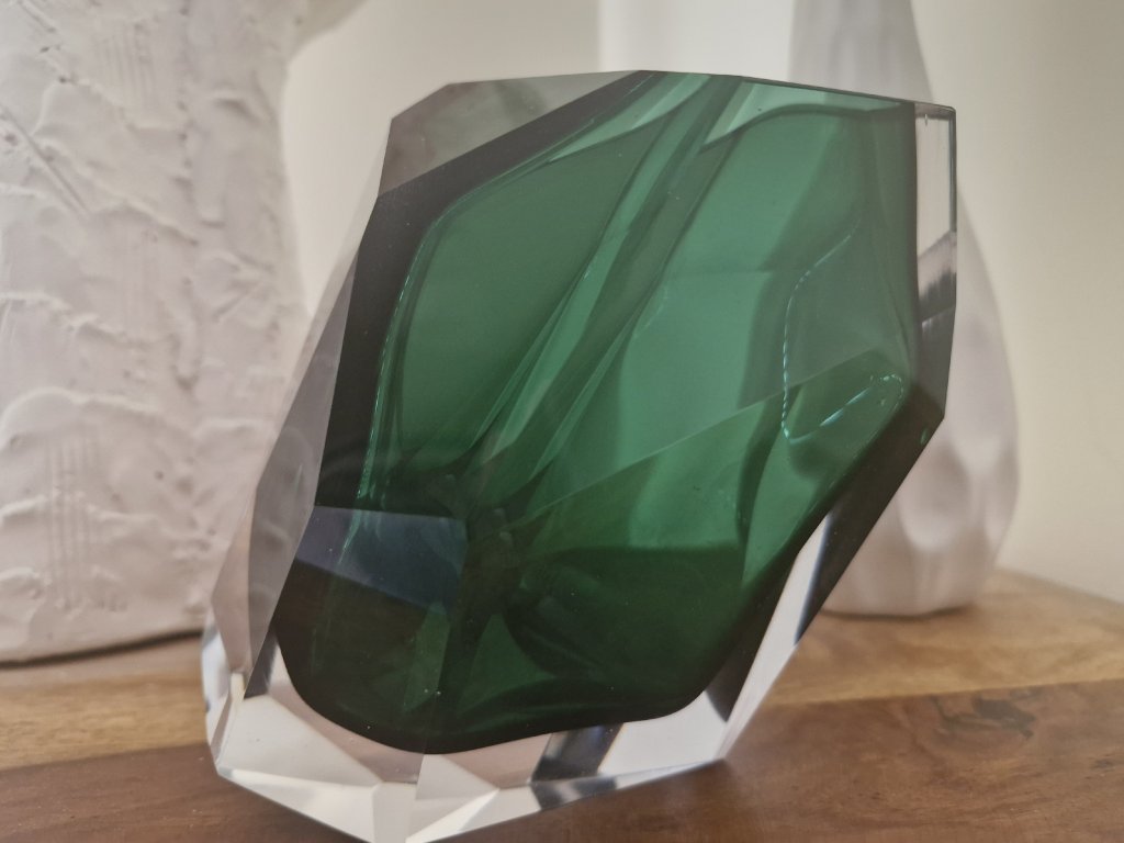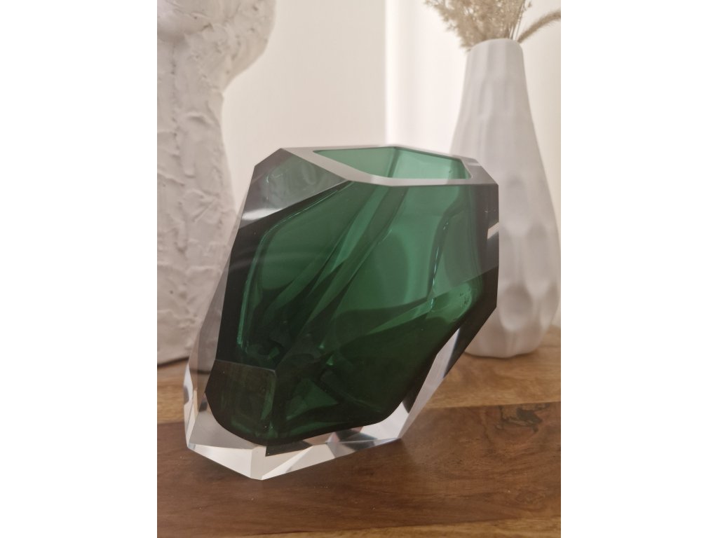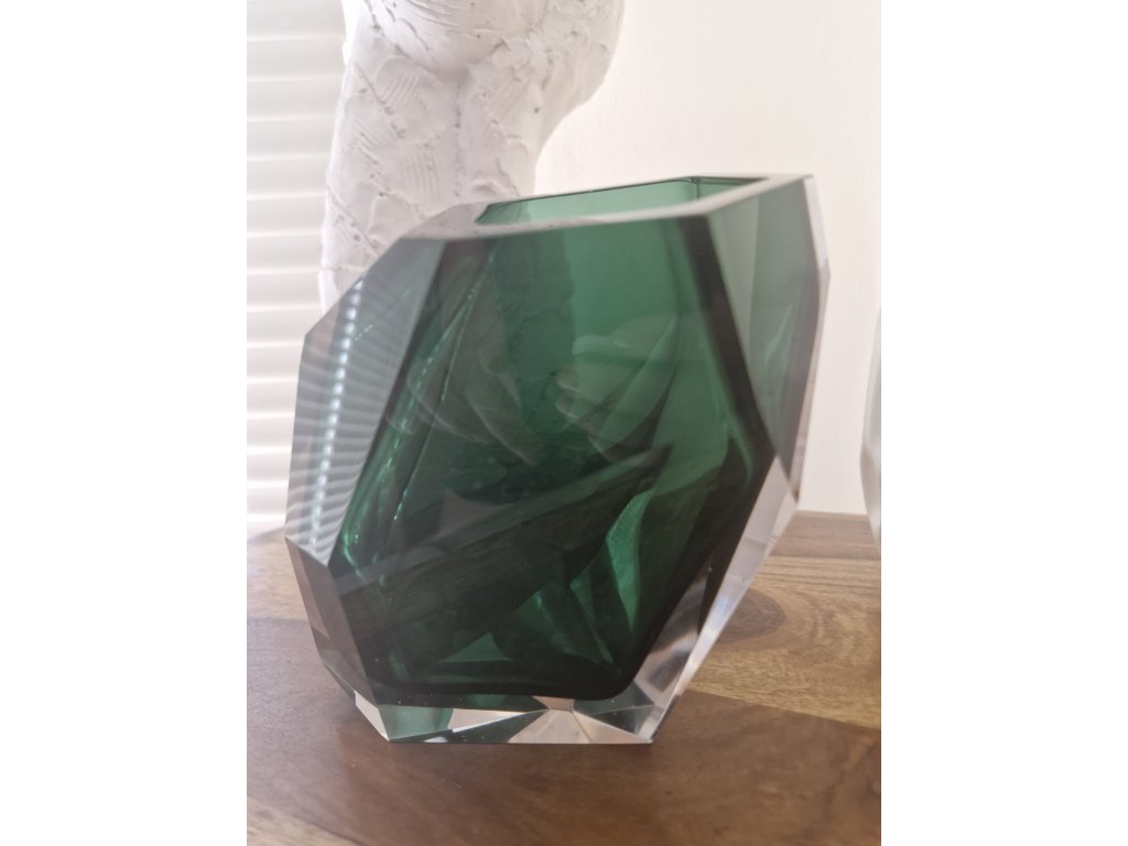 Exkluzivní ručně foukaná hranovaná váza s nakloněnou rovinou. Designerský návrh uznávaného izraelského sklářského dizajnéra Arika Levyho. Nádherná silueta broušená do velkých ploch, které dají vyniknout konečnému tvaru této nádherné vázy. Výška 16 cm. 100% TOP stav nového zboží. Nádherná tmavě zelená barva skloviny dává vyniknout ladným liniím. Produkce neskutečně šikovných sklářů a brusičů sklárny LASVIT Nový Bor.
