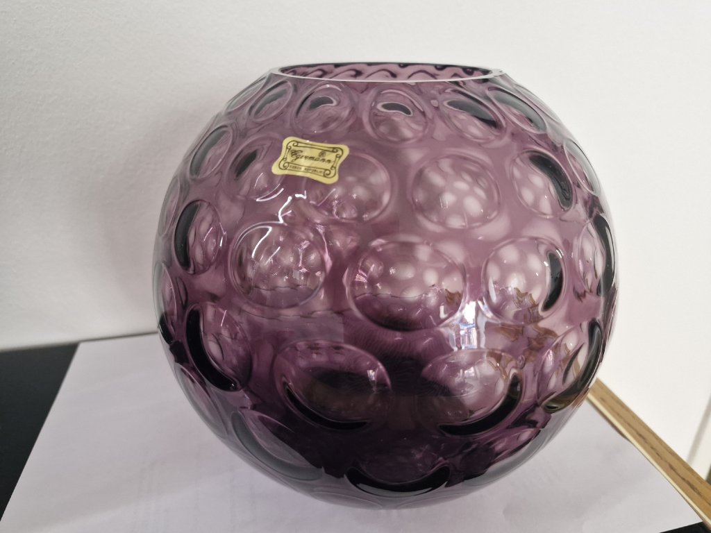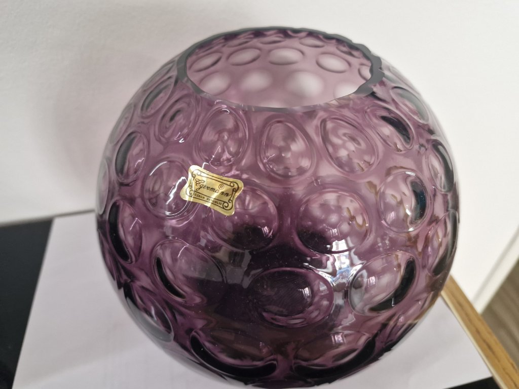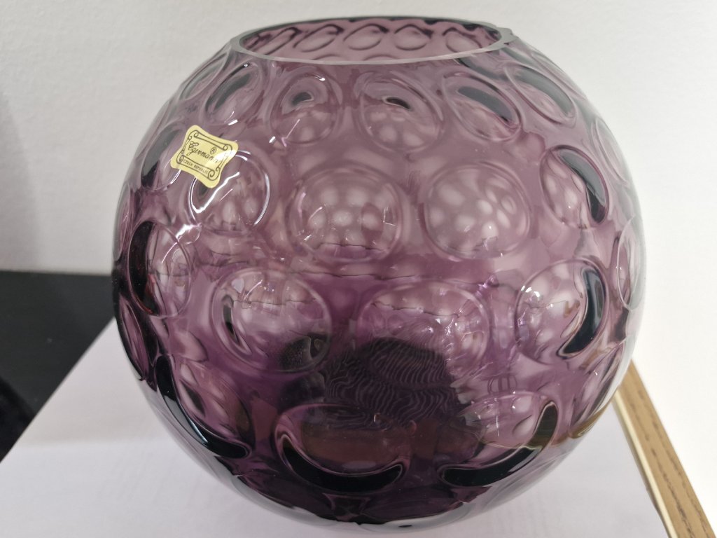 Nádherná fialová váza z foukaného skla ve tvaru koule s dekorem optických čoček dle původního návrhu Maxe Kannegiessera, kolekce NEMO. Provedla sklárna Egermann, Nový Bor, 2. pol. 20. století. Výška 19 cm, průměr v nejširší části 19 cm. S původní nálepkou sklárny. Top stav nového zboží.