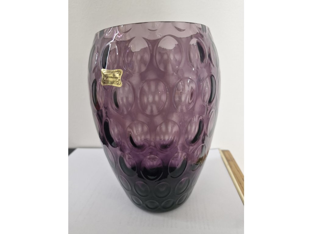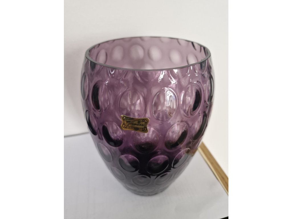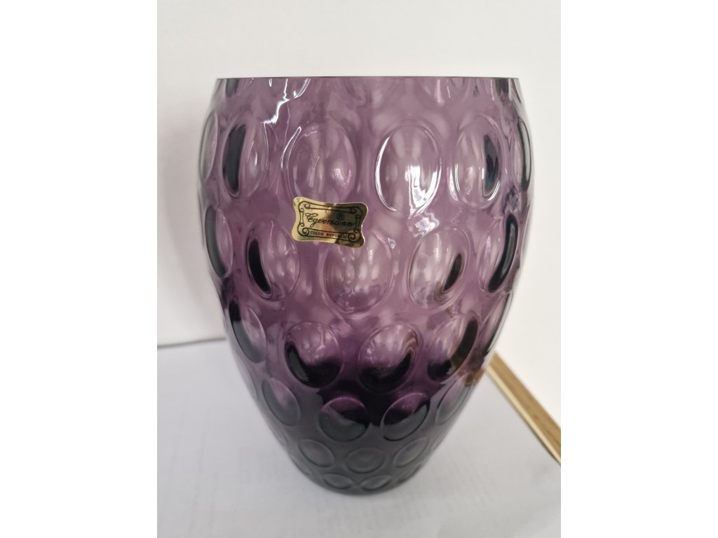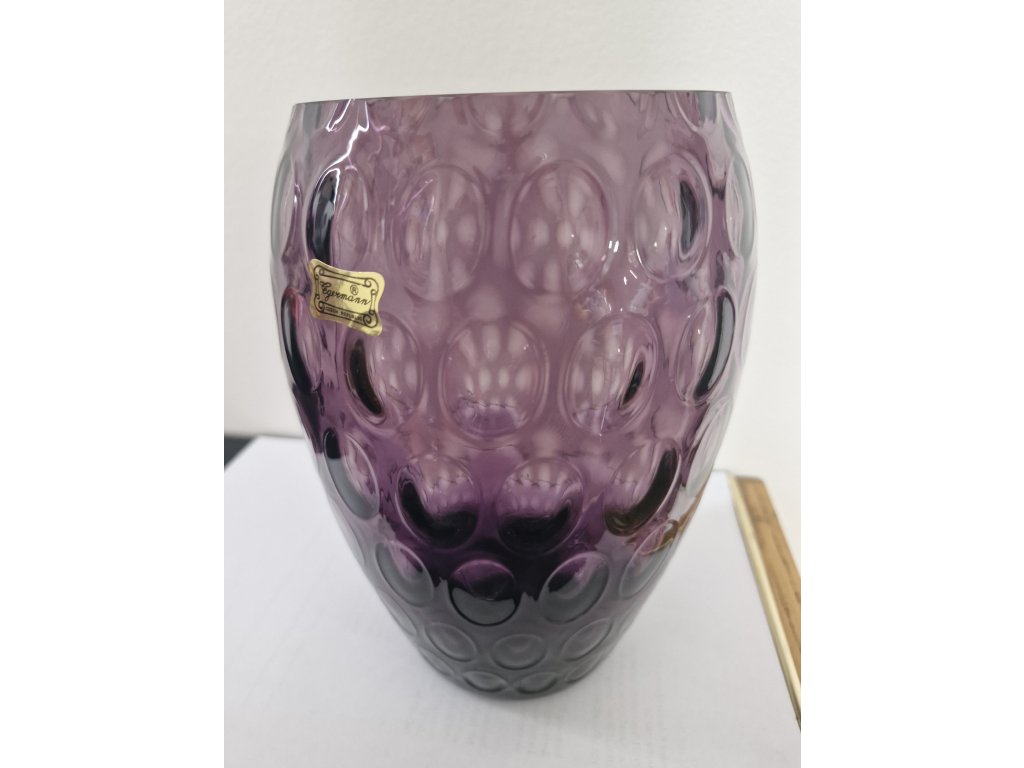 Nádherná fialová váza z foukaného skla s dekorem optických čoček dle původního návrhu Maxe Kannegiessera, kolekce NEMO. Provedla sklárna Egermann, Nový Bor, 2. pol. 20. století. Výška 22 cm. S původní nálepkou sklárny. Top stav nového zboží.
