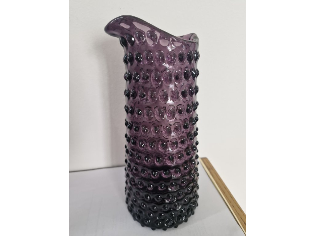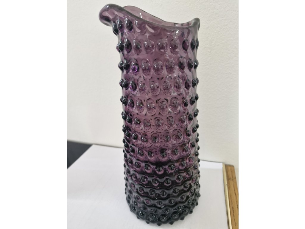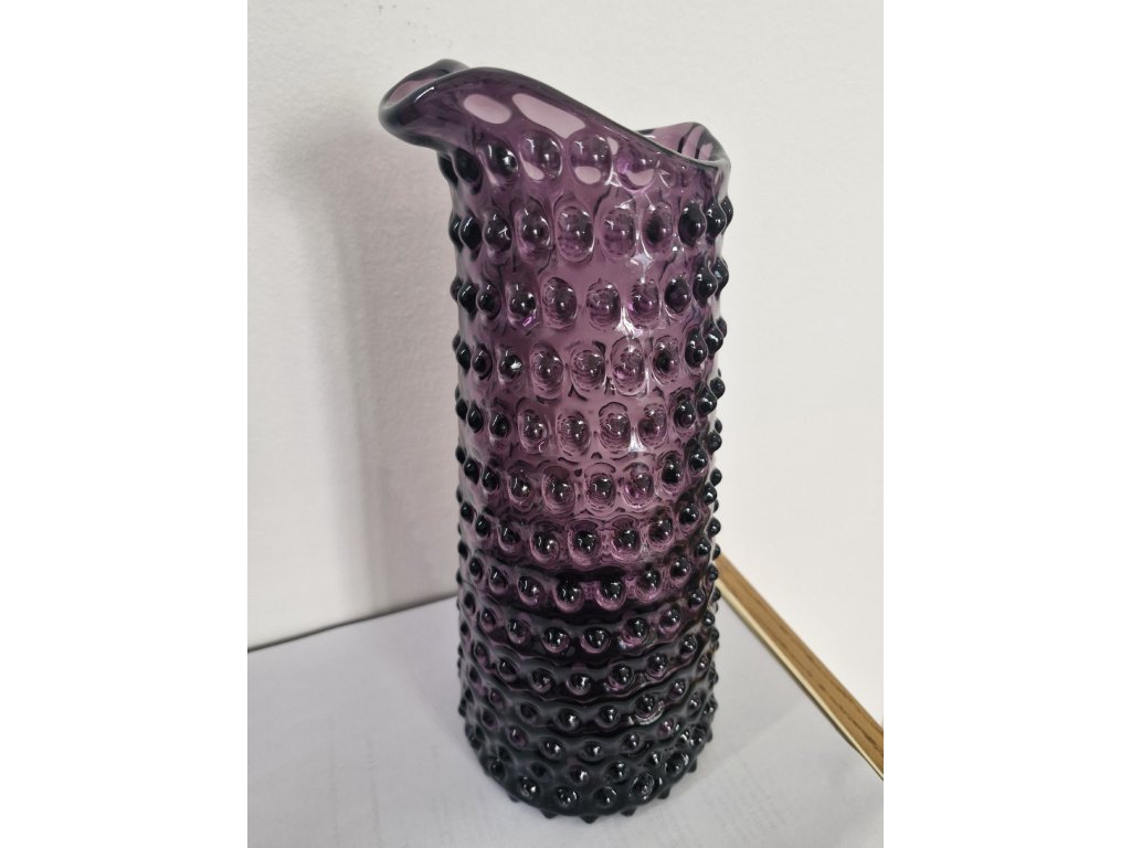 Nádherný fialový džbán z foukaného skla z produkce sklárny Egermann, Nový Bor, 90. léta 20. století. Jelikož nemá ouško, lze ho použít i jako vázu :) Výška 26 cm. Top stav nového zboží.