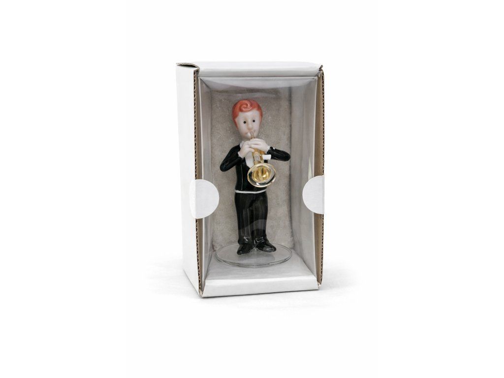 Skleněná figurka hudebníka s trubkou. Velmi jemná v detailech, barevné sklo hutně tvarované nad plamenem. Autorský návrh prof. Jaroslav Brychta, sklárna ŽBS, 60. léta 20. století. Výška figurky cca 9 cm. Figurka je v top sběratelském stavu v originální krabičce, která nebyla nikdy otevřená.