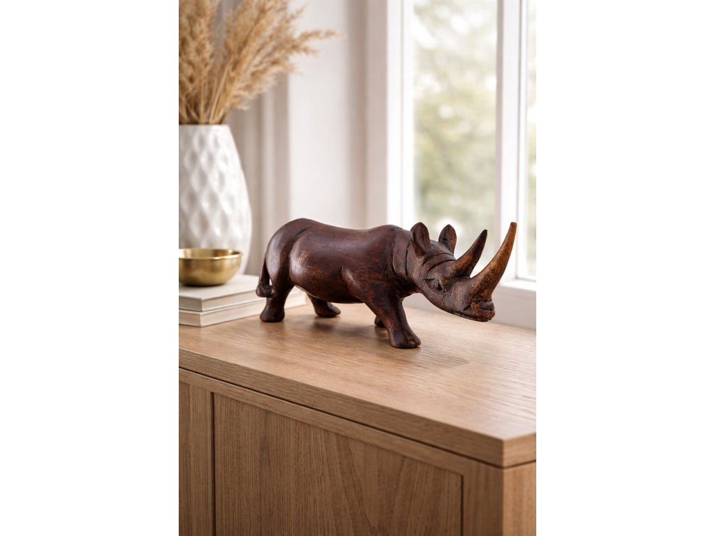 Krásná originální interiérová dekorace z mahagonového dřeva - nosorožec. Ruční práce z Juhoafrické republky. Výška 10 cm, délka 24 cm. Top stav.