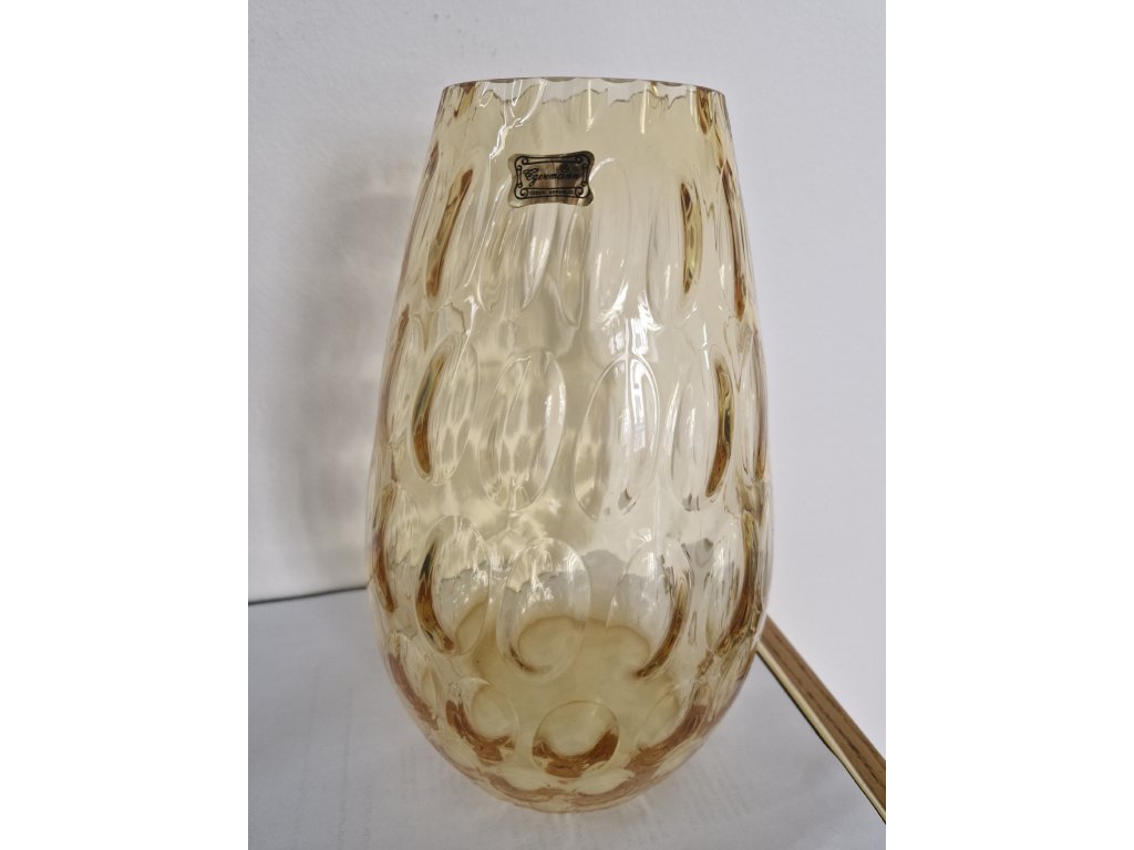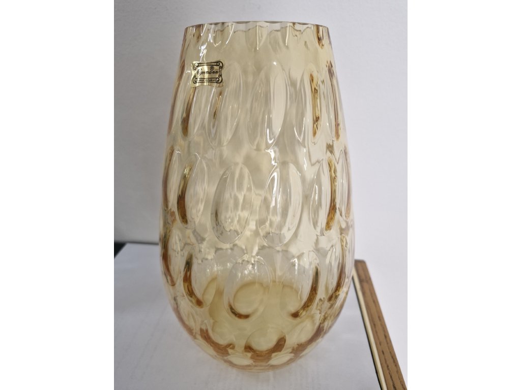 Nádherná jantarová váza z foukaného skla ve vyšíí variantě s dekorem optických čoček dle původního návrhu Maxe Kannegiessera, kolekce NEMO. Provedla sklárna Egermann, Nový Bor, 2. pol. 20. století. Výška 26 cm. S původní nálepkou sklárny. Top stav nového zboží.