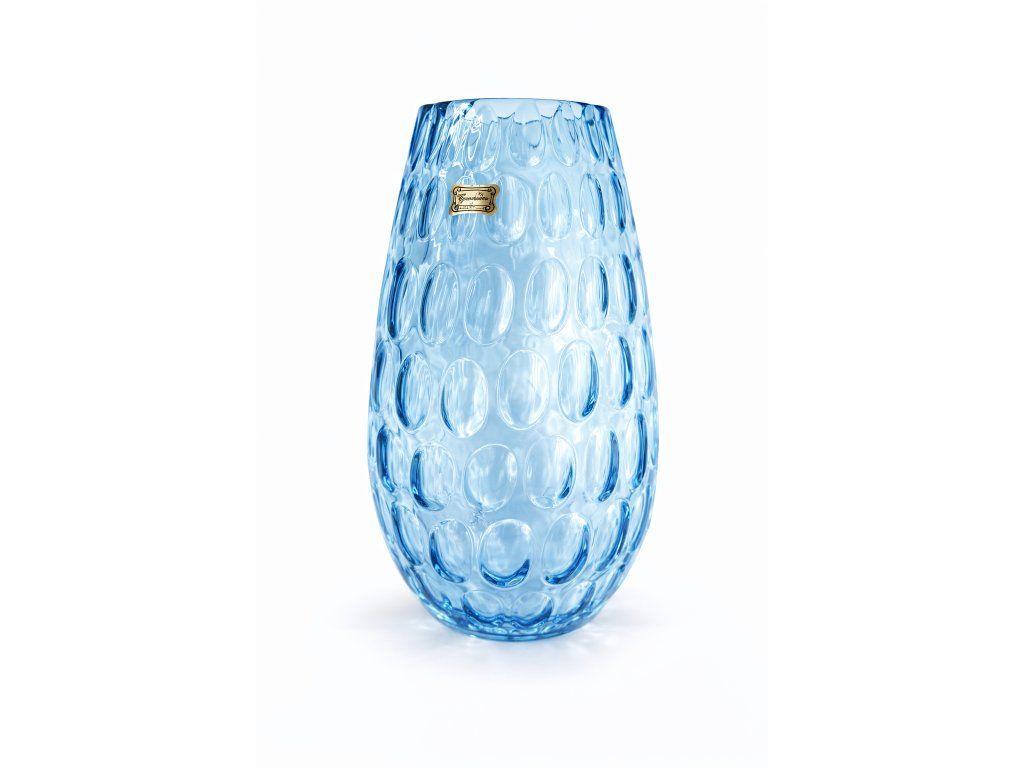 Nádherná jemně modrá váza z foukaného skla ve vyšíí variantě s dekorem optických čoček dle původního návrhu Maxe Kannegiessera, kolekce NEMO. Provedla sklárna Egermann, Nový Bor, 2. pol. 20. století. Výška 26 cm. S původní nálepkou sklárny. Top stav nového zboží.
