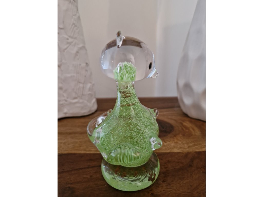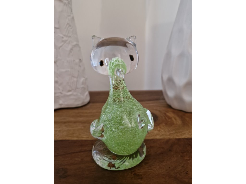 Krásná kočička z foukaného skla s částečky fosforu (svítí ve tmě). Z produkce sklárny Jílek, Kamenický Šenov.