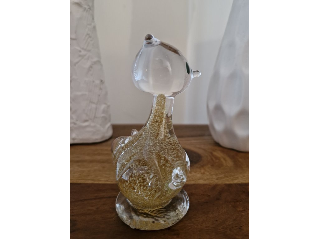 Krásná kočička z foukaného skla s částečky fosforu (svítí ve tmě). Z produkce sklárny Jílek, Kamenický Šenov.
