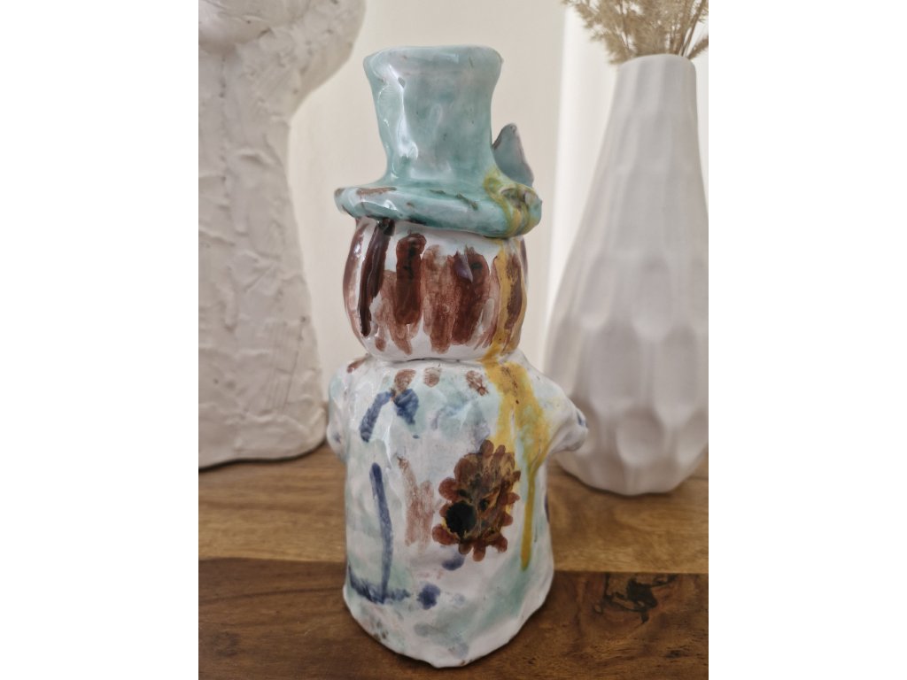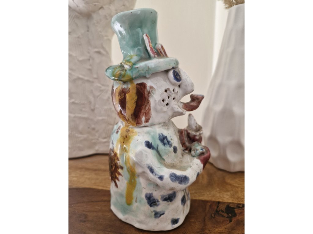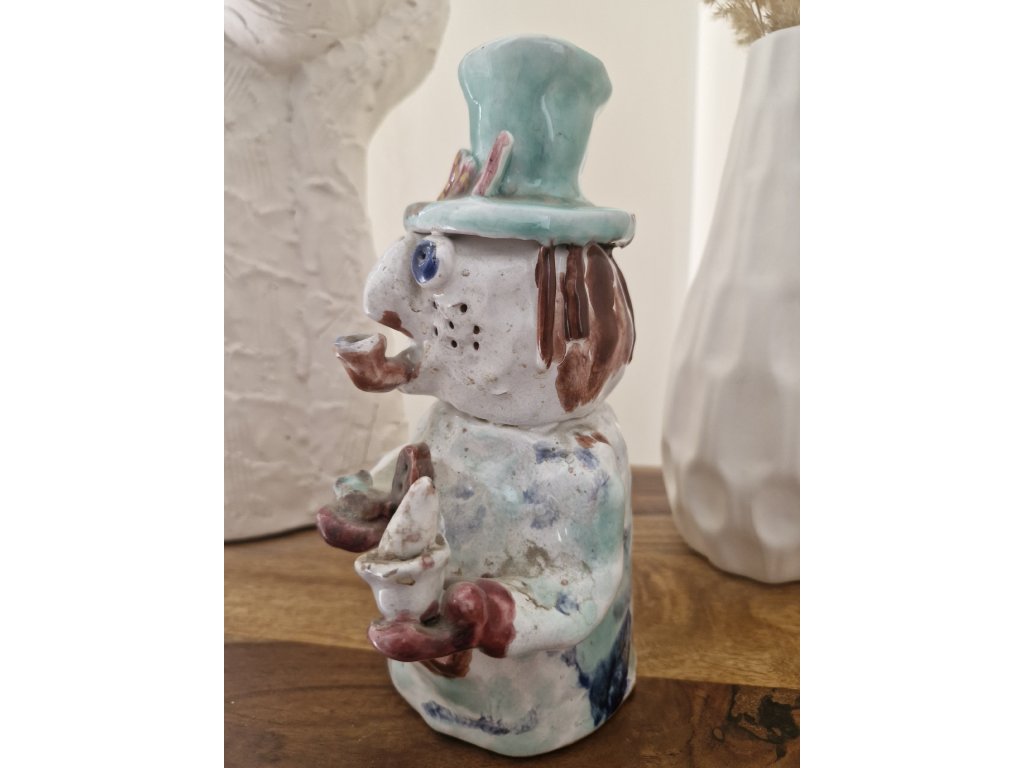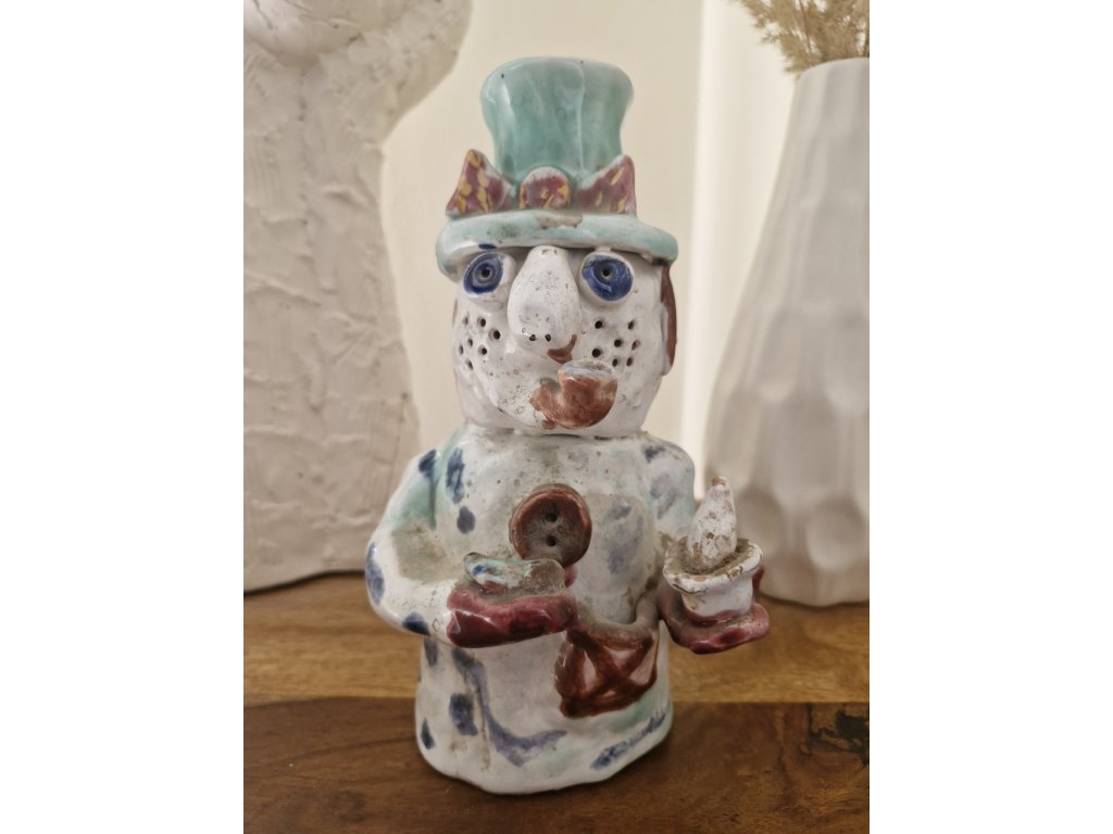 Krásná figurka z glazované keramiky zobrazující pana v klobouku. Není signovaná, ale hodně připomíná tvorbu Viktora Vegrichta, uznávaného českého výtvarníka, nar. v r. 1934. Výška 20 cm. Top stav.
