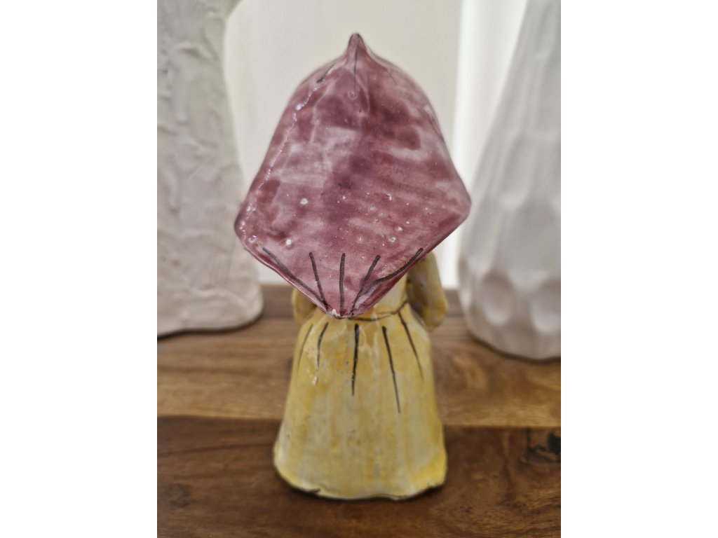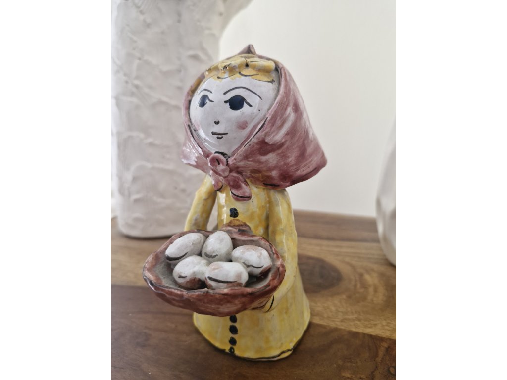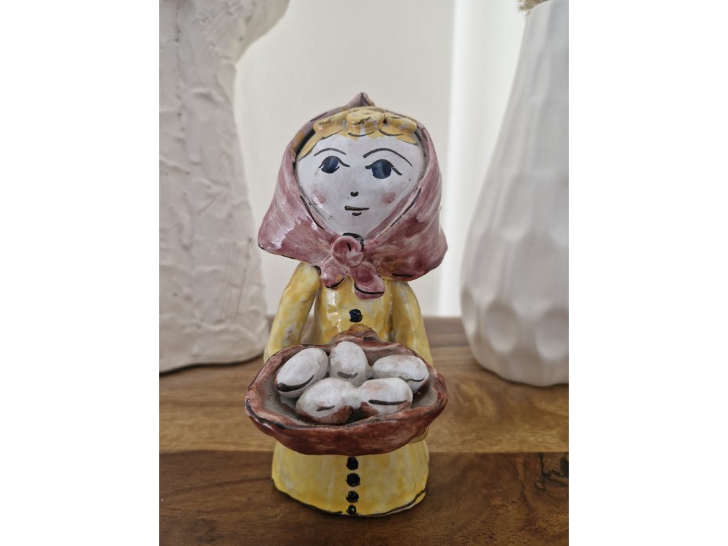 Krásná figurka z glazované keramiky zobrazující selku s vajíčky. Není signovaná, ale hodně připomíná tvorbu Viktora Vegrichta, uznávaného českého výtvarníka, nar. v r. 1934. Výška 16 cm. Top stav.