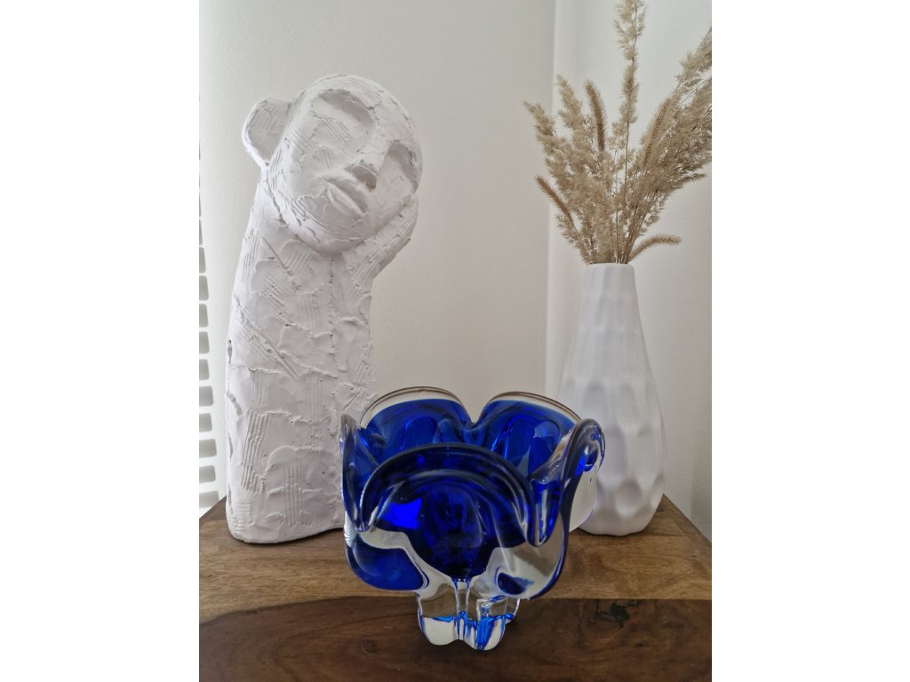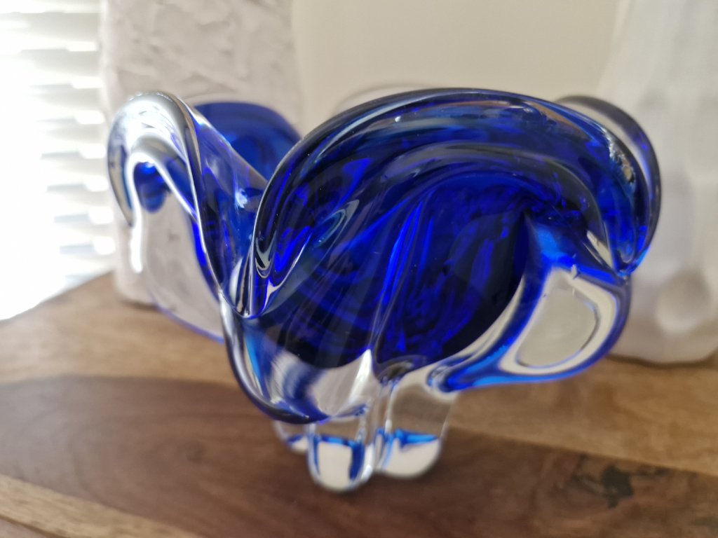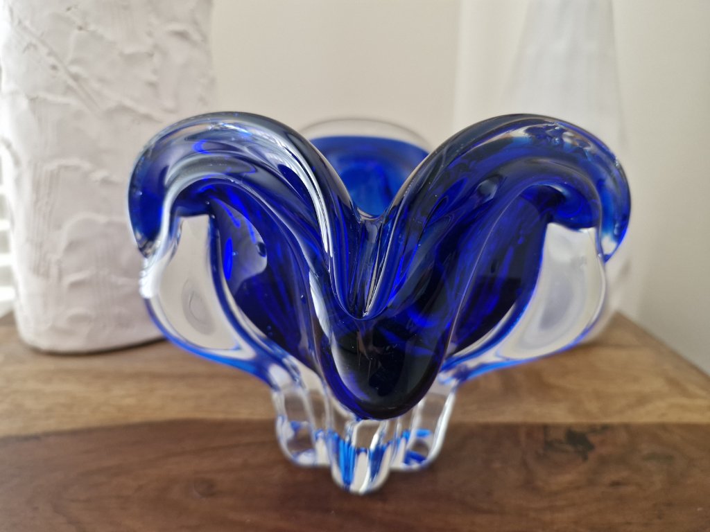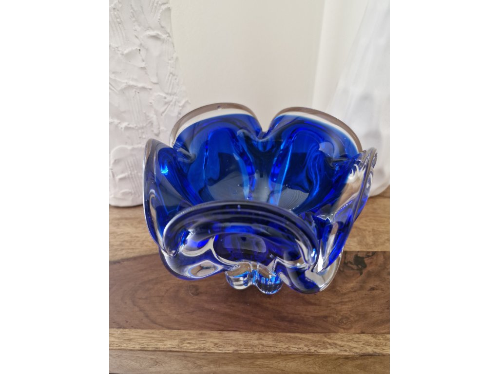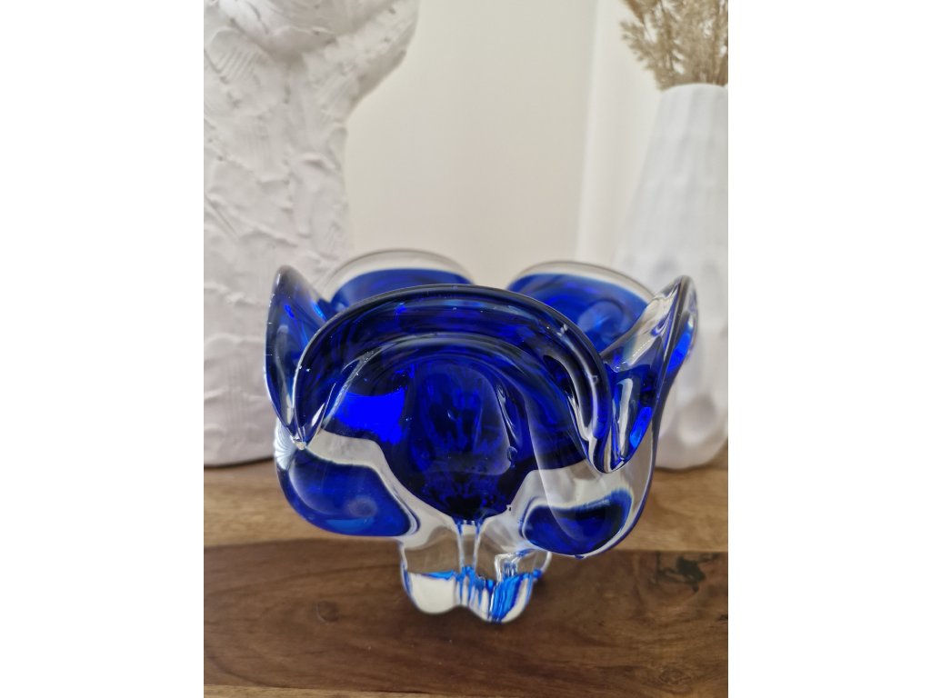 Nádherná masivní kobaltová mísa z hutního skla. Autorský návrh Josef Hospodka, sklárna Chřibská, 60. léta 20. století. Výška 13 cm, průměr 17 cm. Top stav.