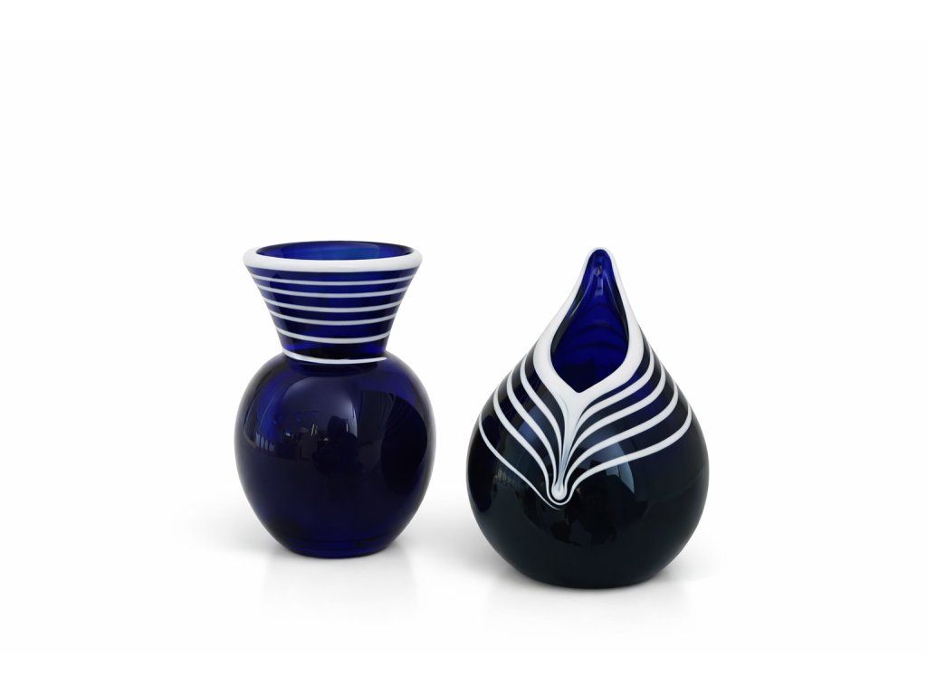 Krásná sada z hutního skla v nádherné poctivé "škrdlovické" kobaltové barvě s bílými nálepy z produkce Art Glass PRINC, Žďár nad Sázavou. Výška každé vázy 15 cm. Top stav.