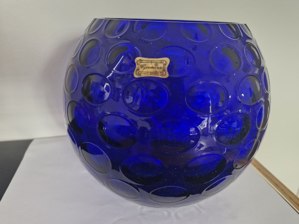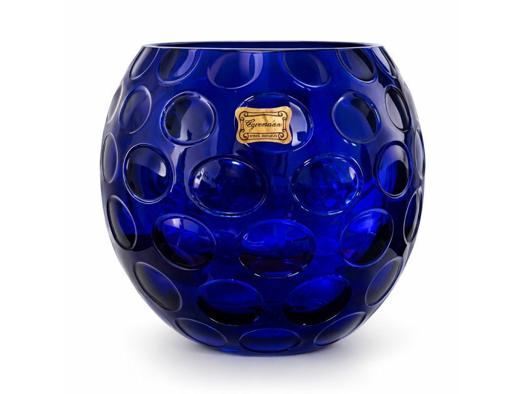 Nádherná kobaltová váza z foukaného skla ve tvaru koule s dekoremoptických čoček inspirována původním návrhem Maxe Kannegiessera, kolekce NEMO. Provedla sklárna Egermann, Nový Bor, 2. pol. 20. století. Výška 18 cm, šířka v nejširší části 21 cm. S původní nálepkou sklárny. Top stav nového zboží.