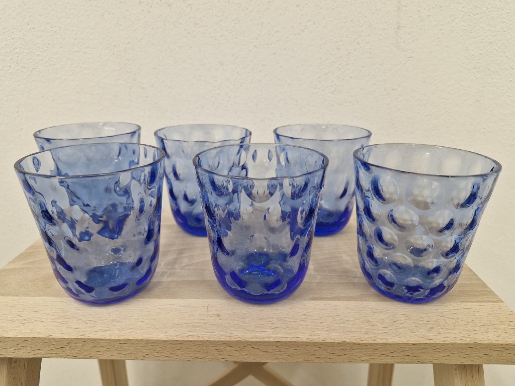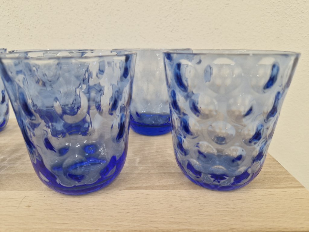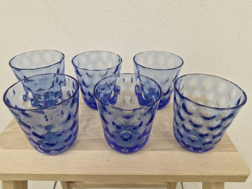 Nádherné skleničky z foukaného skla (sada 6 ks), ručně dodělávané. Dle původního návrhu Maxe Kannegiessera, kolekce NEMO. Z produkce sklárny Egermann, Nový Bor, 90. léta 20. století. Výška 12 cm, objem 250 ml. S plastickým diagonálním vzorem. Top stav nového zboží. Každý kus je originál.