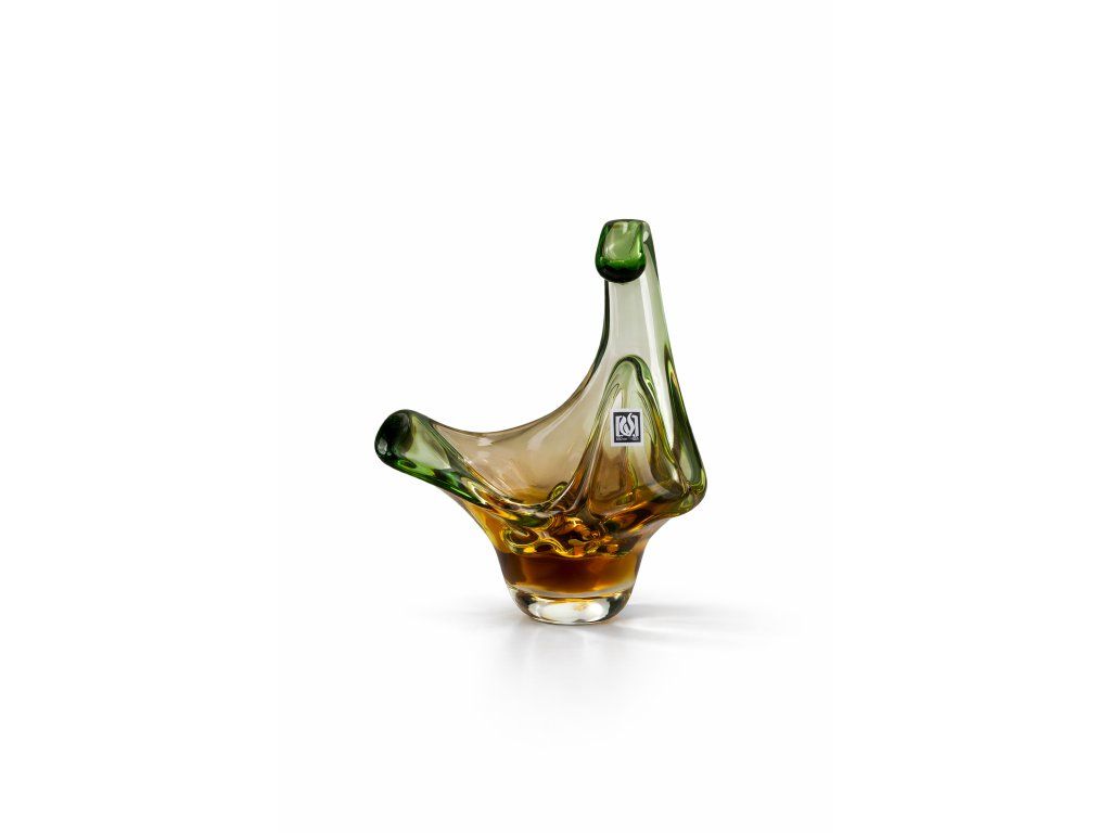 Parádní sběratelský kousek ! Košík z hutního skla z kolekce NIAGARA dle autorského návrhu Karla Zemka, sklárna Mstišov, r. 1963. V méně vídané růžové zelené barevné kombinaci. S původním značením. Výška 21 cm. 100% TOP stav.