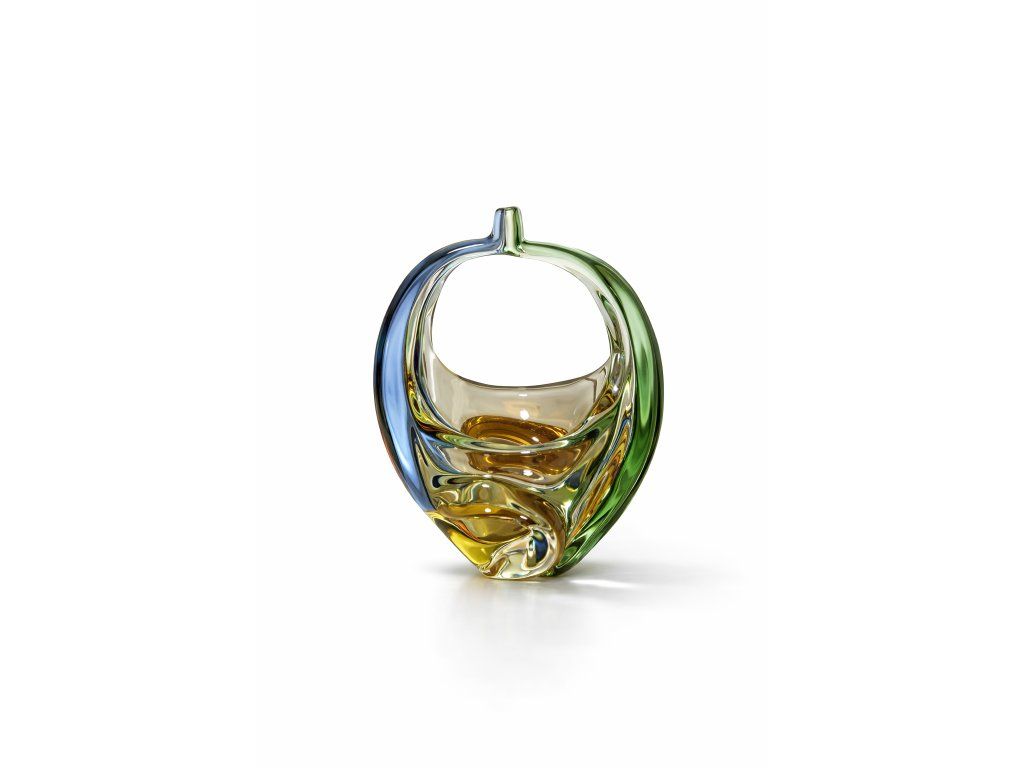 Krásný košíček z hutního skla s barevnými nálepy dle autorského návrhu Karla Zemka, sklárna Mstišov, r. 1963. Výška 15 cm. 100% TOP stav.