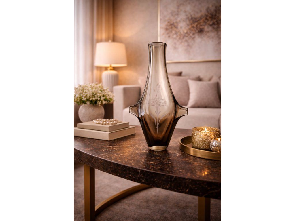 Krásná váza z kouřového skla s rytinou květů dle autorského návrhu Miloslava Klingera, sklárna ŽBS, 60. léta 20. století. Výška 29 cm. Top stav.