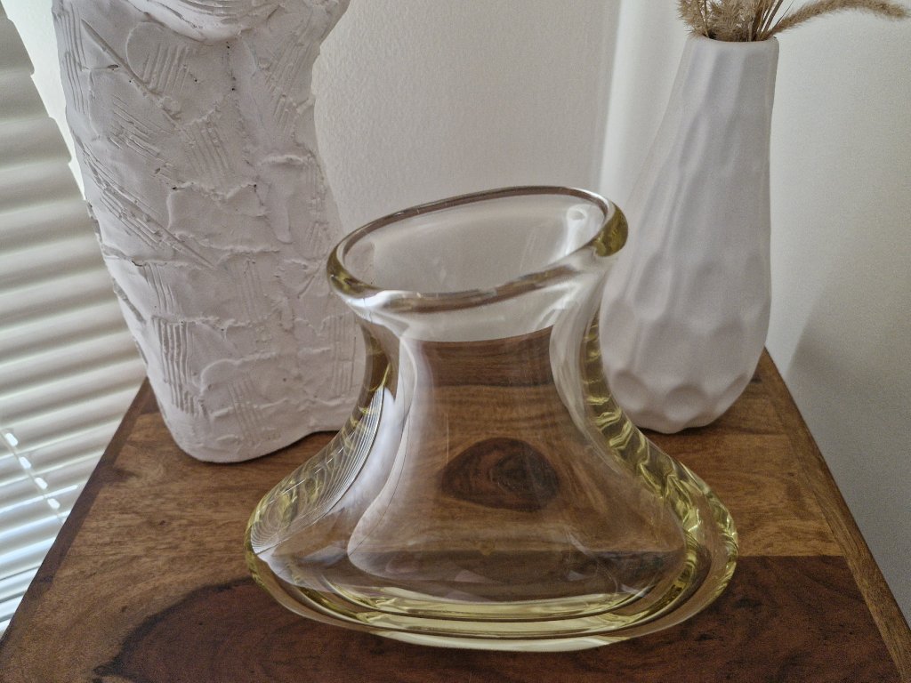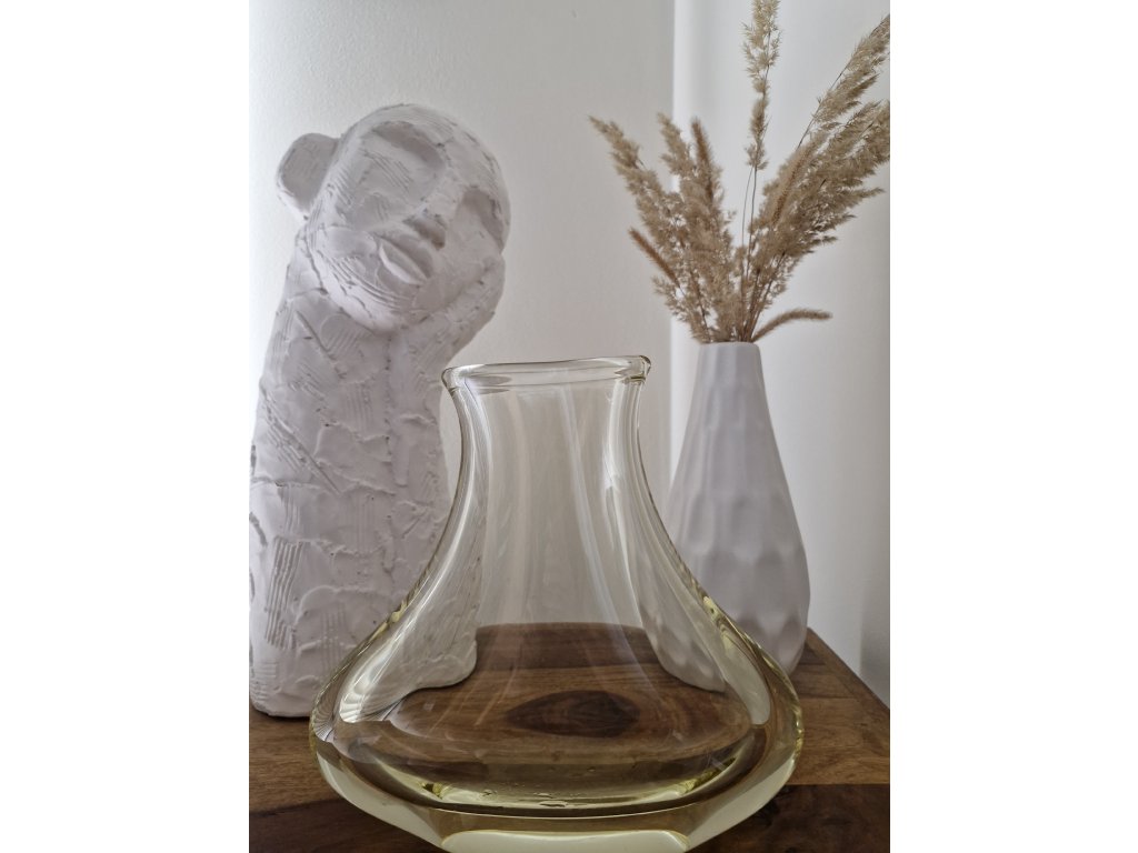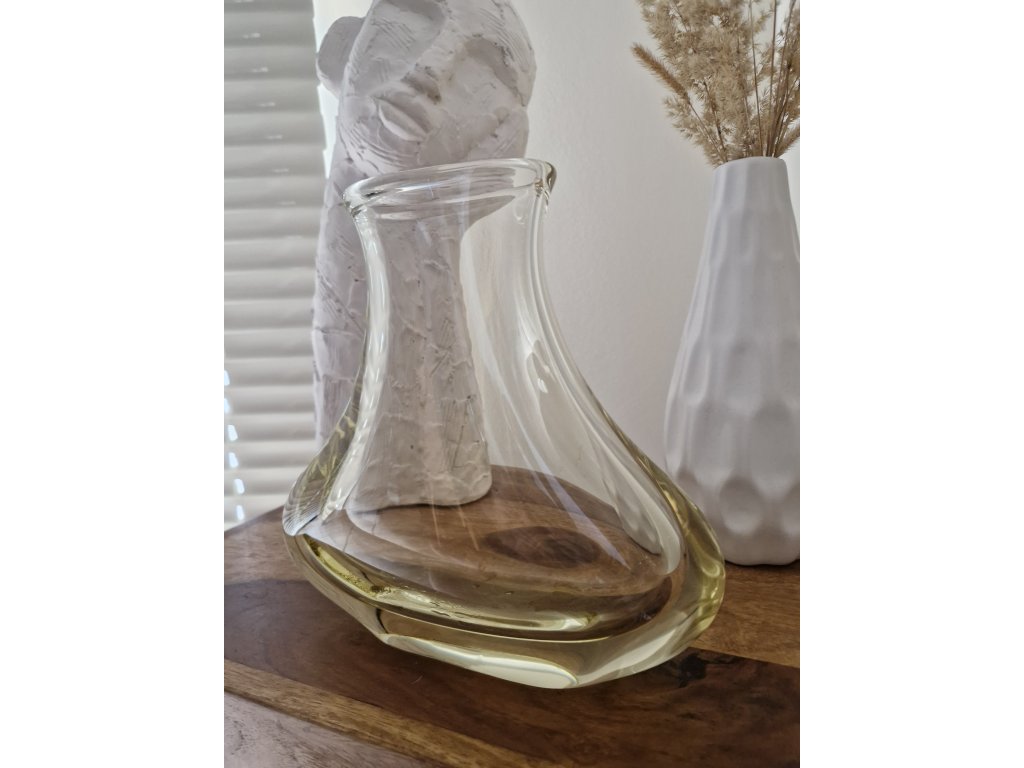 Nádherná citrínová váza z hutního skla v netradičném tvaru dle autorského návrhu Miloslava KLingera, sklárna ŽBS, 60. léta 20. století. Výška 22 cm, šířka v nejširší části 23 cm. 100% TOP stav.