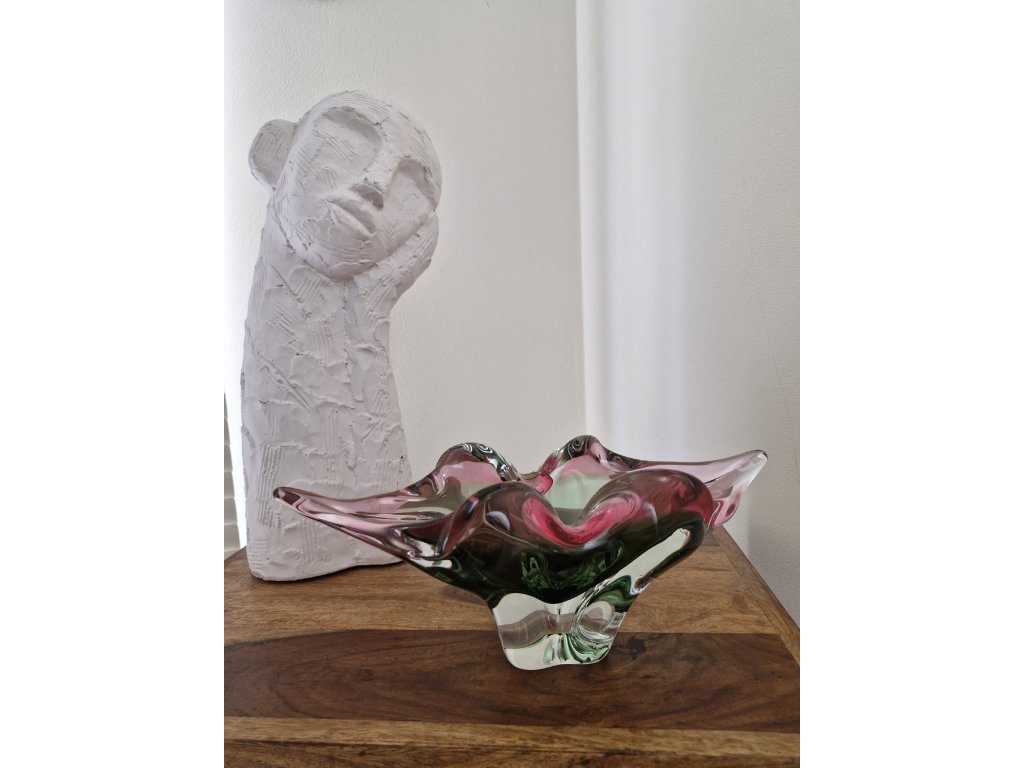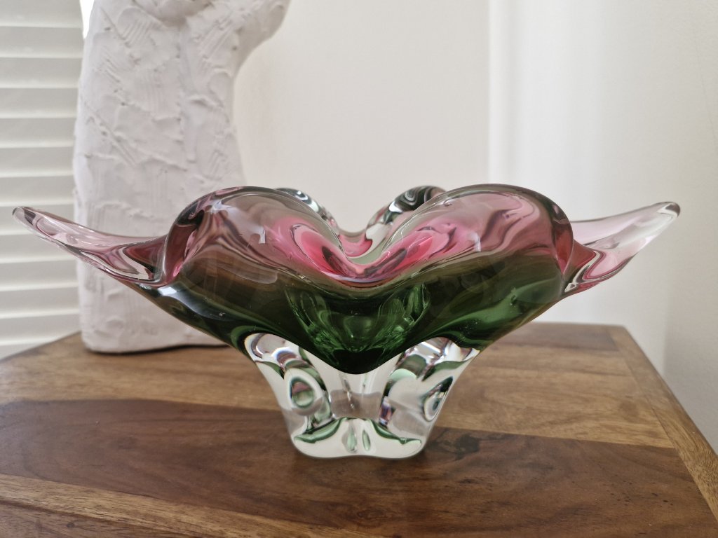 Krásná mísa z hutního skla v nádherné, málo vídané kombinaci barev - rúžovo - zelená. Autor návrhu Josef Hospodka, sklárna Chřibská, 60. léta 20. století. Výška 11 cm, délka 31 cm. Top stav.