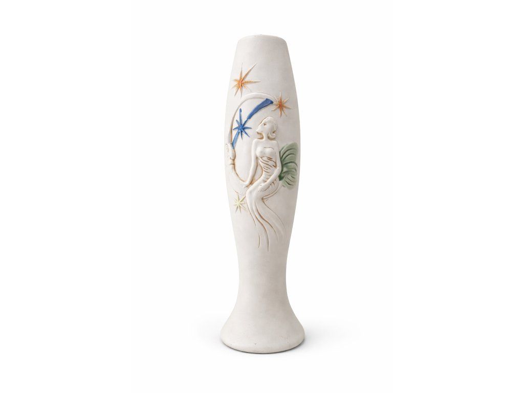 Krásná keramická váza s dekorem měsíce a sedící ženy. 1. pol. 20. století, Čechy. Na podstavě značeno. V top stavu. Výška 36 cm.