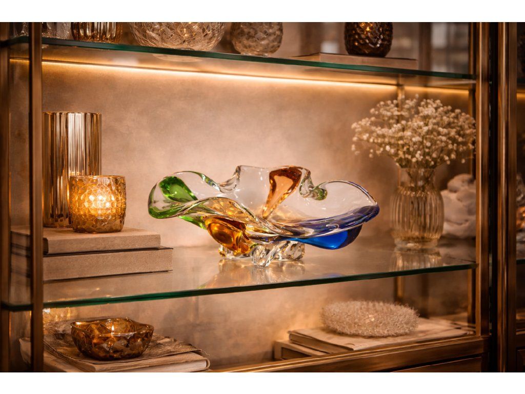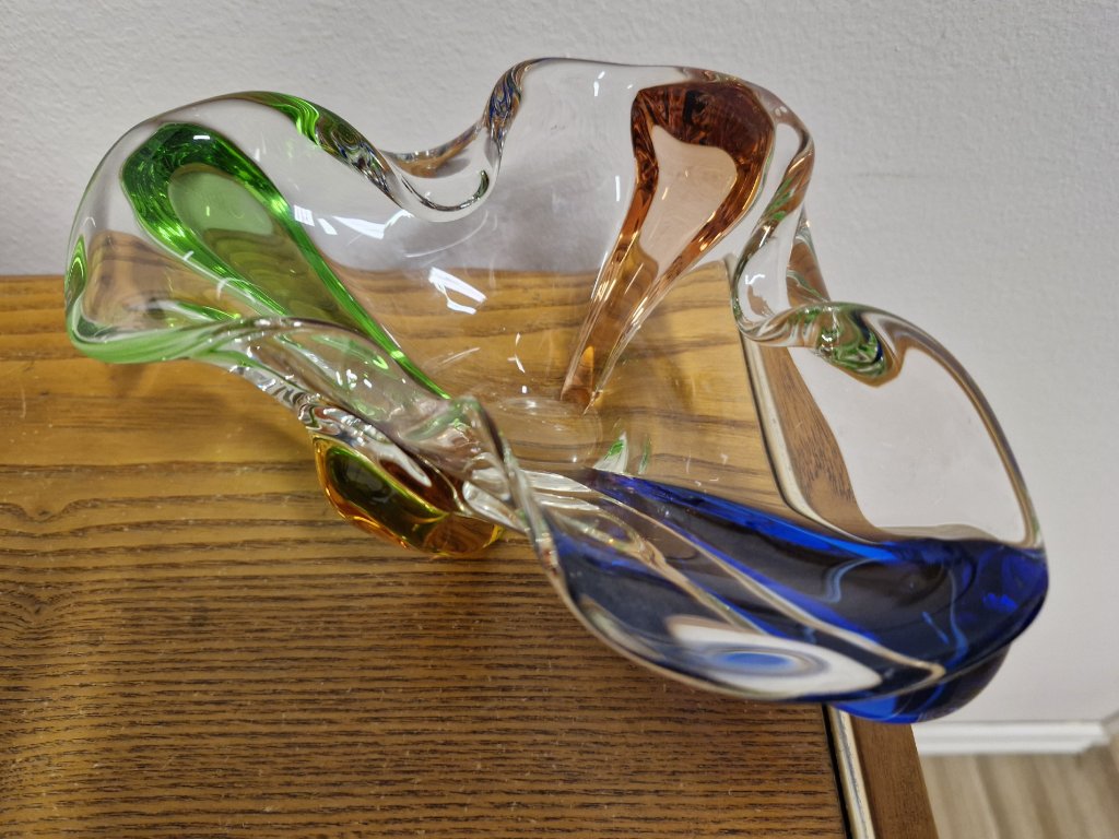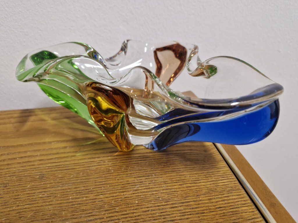 Krásná mísa z hutního skla s barevnými nálepy dle autorského návrhu Karla Zemka, sklárna Mstišov, r. 1963. Výška 8 cm, délka 23 cm. 100% TOP stav.