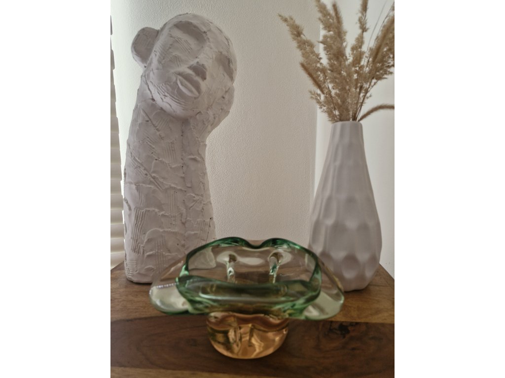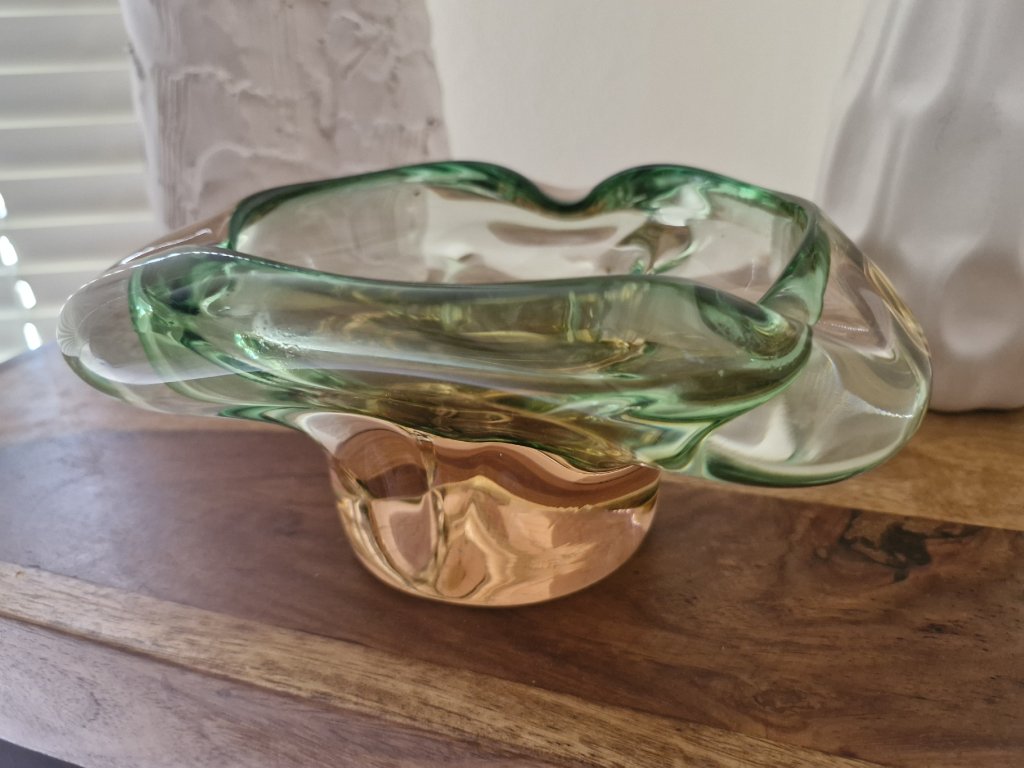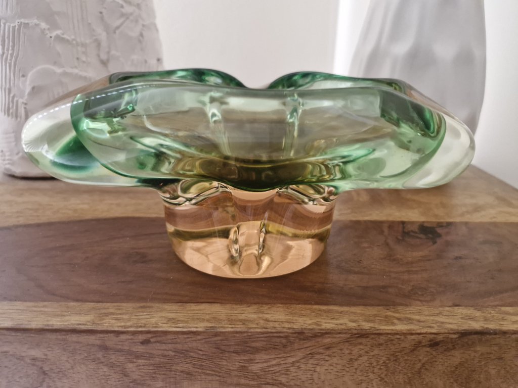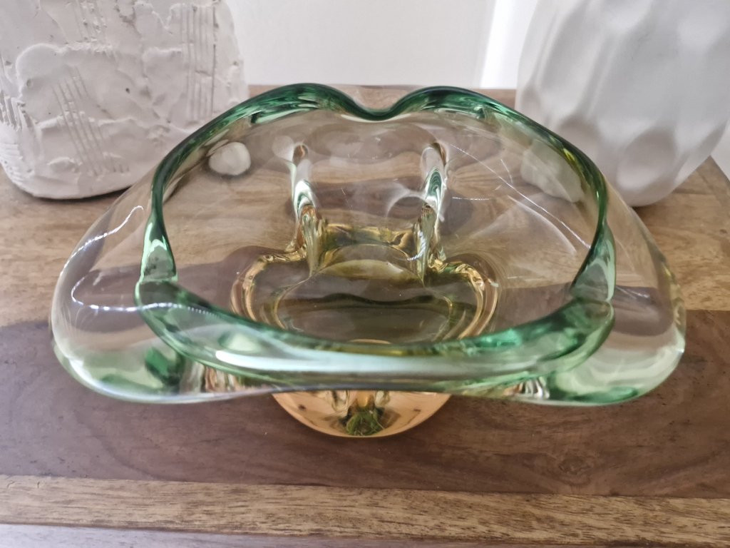 Krásná, masivní miska z hutního skla dle autorského návrhu Josefa Hospodky, sklárna Chřibská, 60. léta 20. století. Výška 9 cm, průměr 18 cm. Na podstavě několik nepatrných škrábančeků, nešlo je ani vyfotit. V naší nabídce rovněž několik váz ze stejné kolekce ve stejné barevné kombinaci.