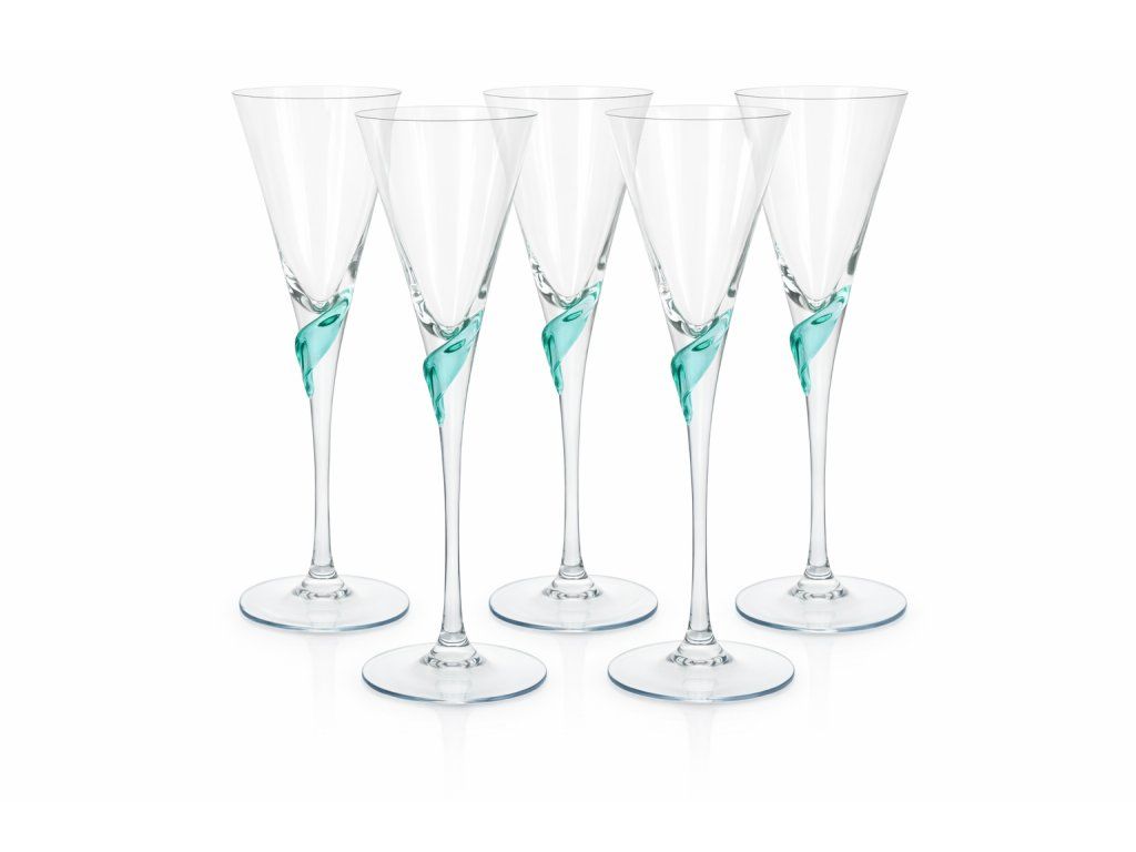 Krásná sada zajímavách skleniček na likér nebo sherry dle autorského návrhu Milana Meteláka, sklárna Harrachov, 60. léta 20. století. Výška 19 cm. 4 skleničky jsou v 100% TOP stavu, pátá má jemnou prasklinku na podstavě - vyfoceno..