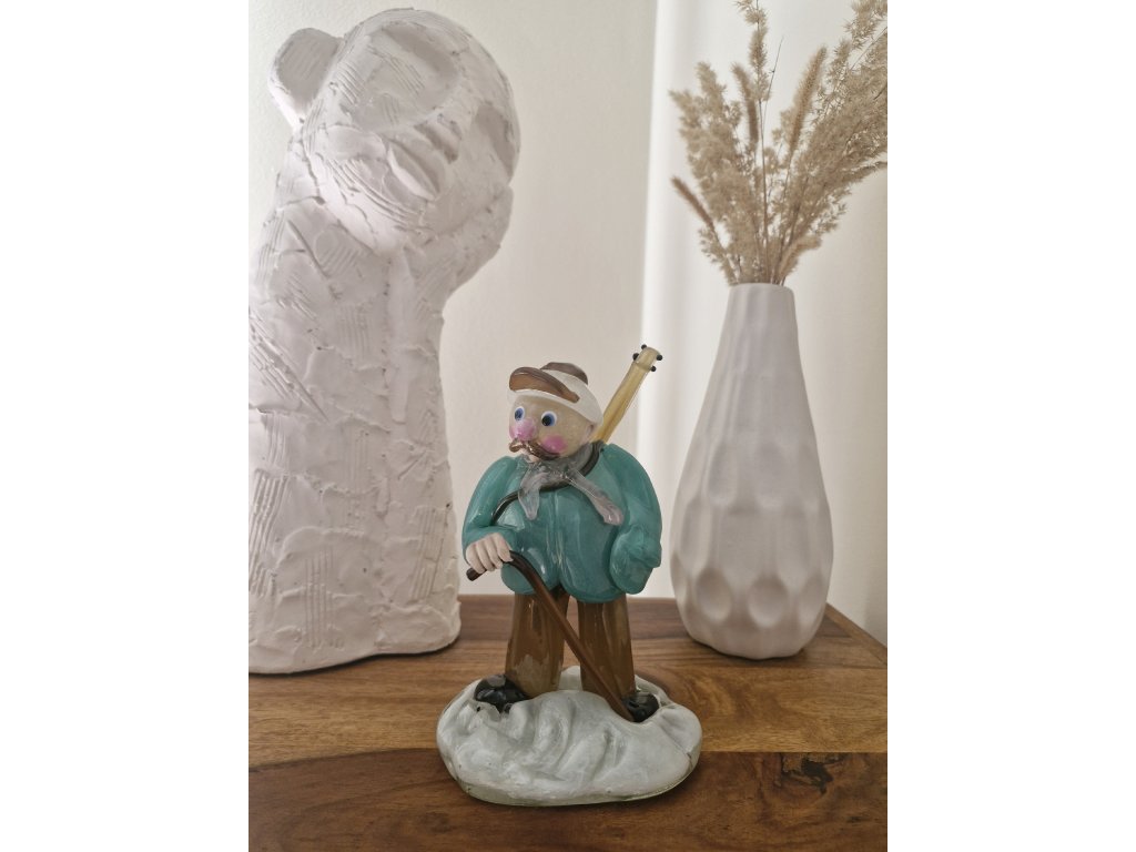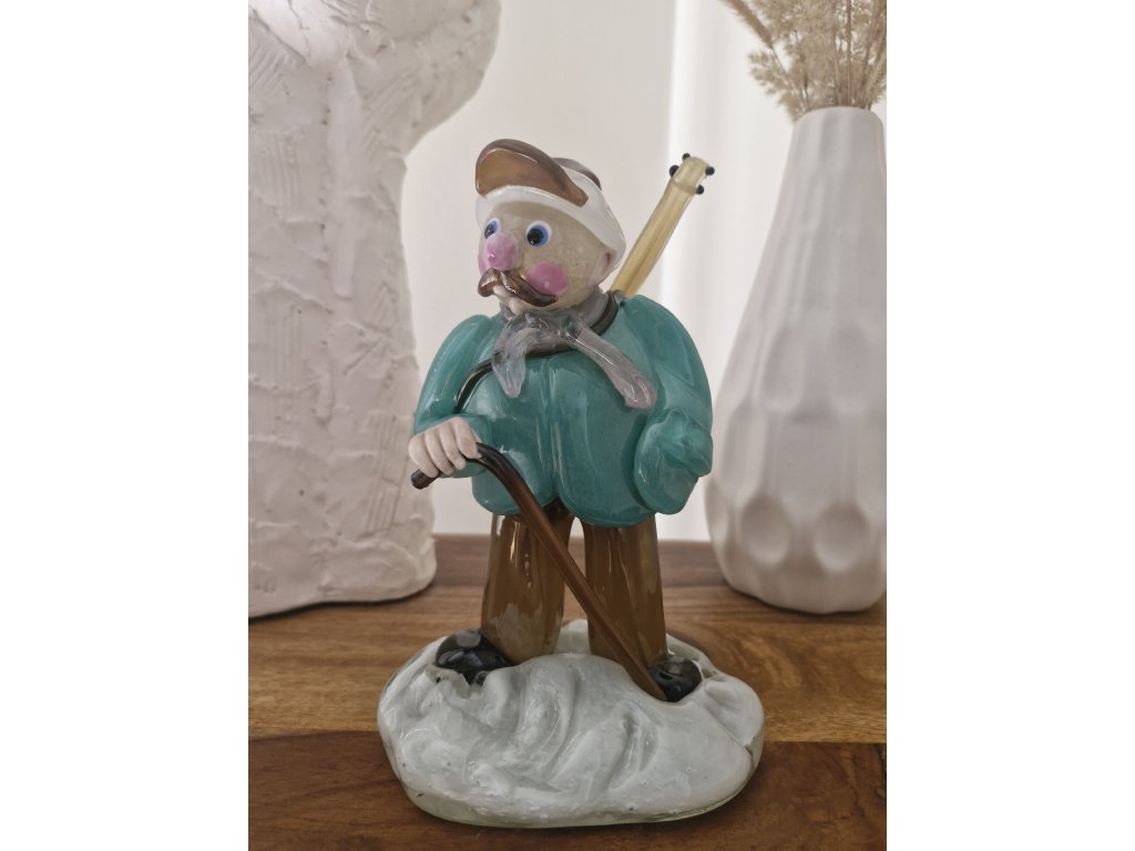 Krásná figurka z hutního skla - VANDRÁK s kytarou. Autor návrhu JAroslav Brychta, sklárna ŽBS, 60. léta 20. století. Výška 19 cm. Top sběratelský stav.