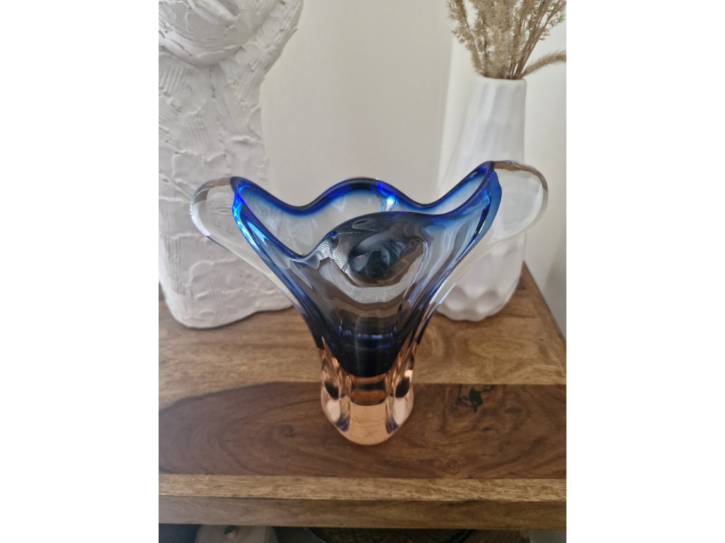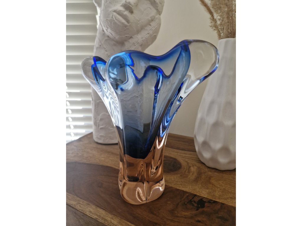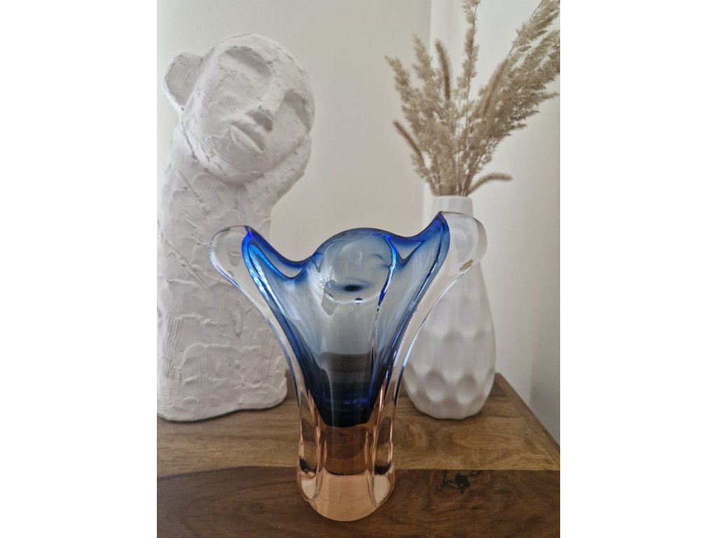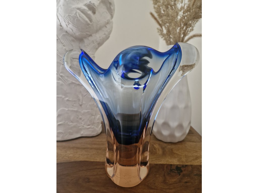 Krásná váza z hutního skla v málo vídaném tvaru dle autorského návrhu Josefa Hospodky, sklárna Chřibská, 60. léta 20. století. Výška 22 cm. Top stav.