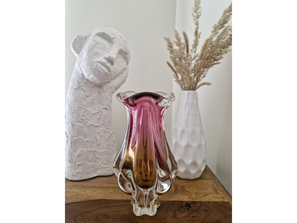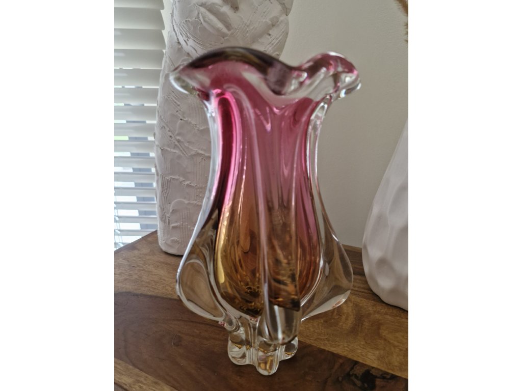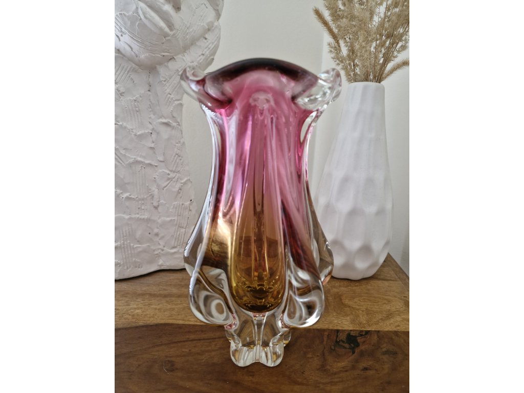 Nádherná váza z hutního skla v krásné růžovo - žluté barevné kombinaci. Autorský návrh Josef Hospodka, sklárna Chřibská, 60. léta 20. století. Výška 24 cm. Luxusní top stav.