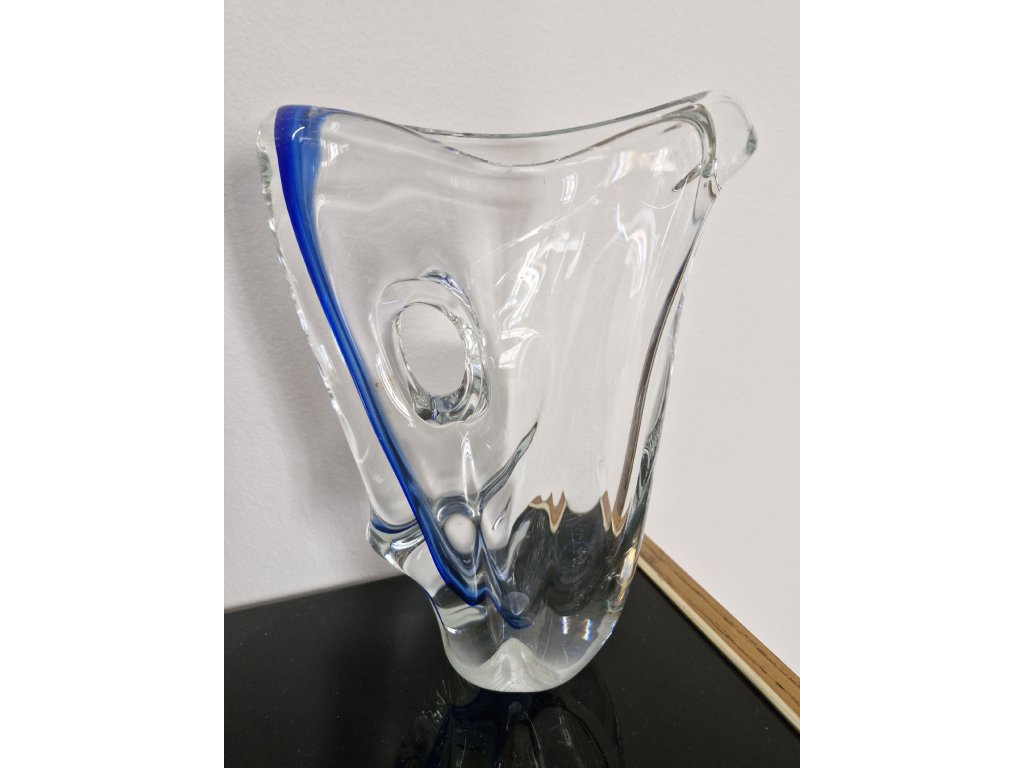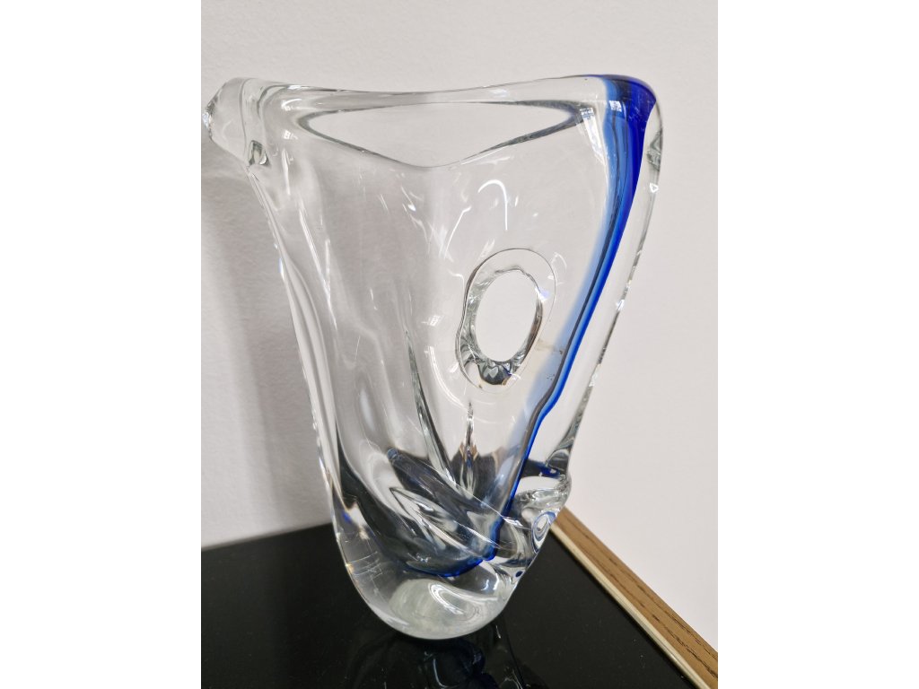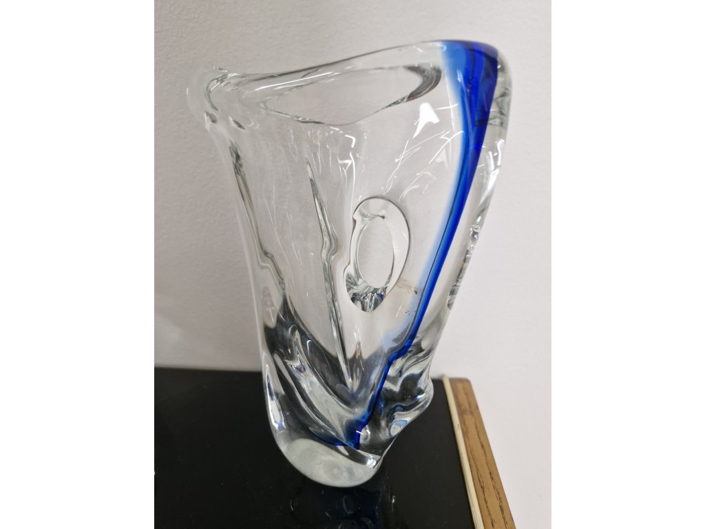 Krásná váza z hutního skla s modrým pruhem na straně dle autorského návrhu Rudolfa Beránka, sklárna Škrdlovice, r. 1969. Výška 23 cm. Top stav.