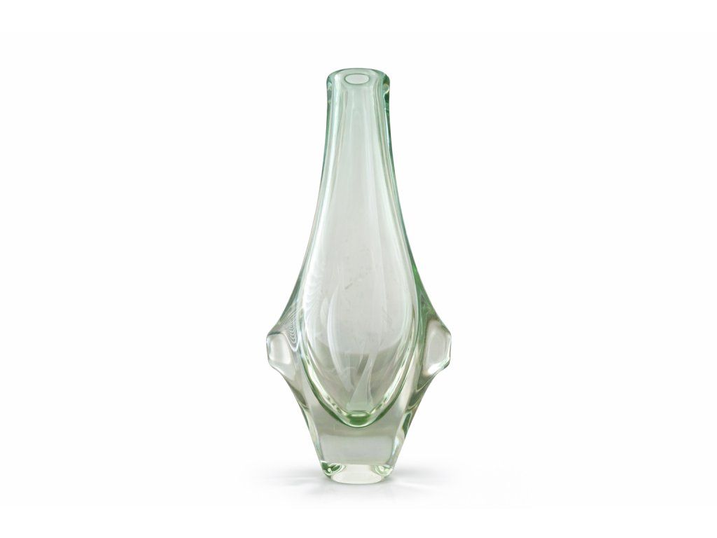 Žluto - zelená váza z hutního skla s rytinou rybiček dle autorského návrhu Miloslava Klingera, sklárna ŽBS, 60. léta 20. století. Výška 26 cm. Top stav.