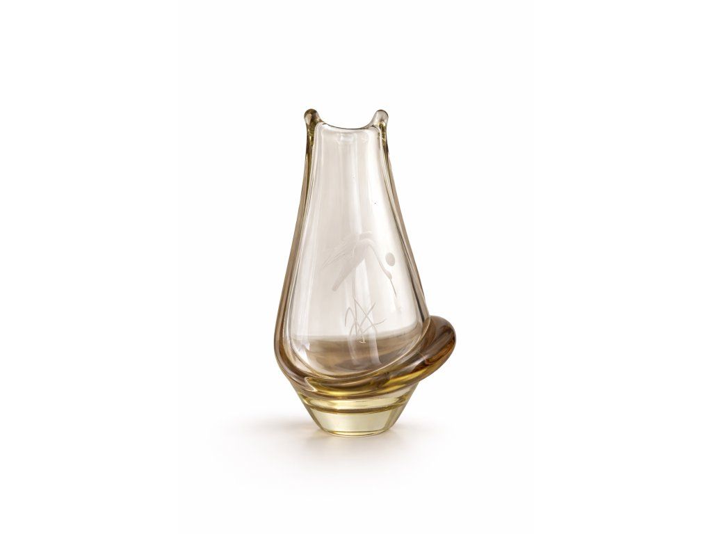 Krásná citrínová váza z hutního skla s hnědým nálepem a rytinou volavky. Autor návrhu Miloslav Klinger, sklárna ŽBS, 60. léta 2é. století. Výška 21 cm. Top stav.