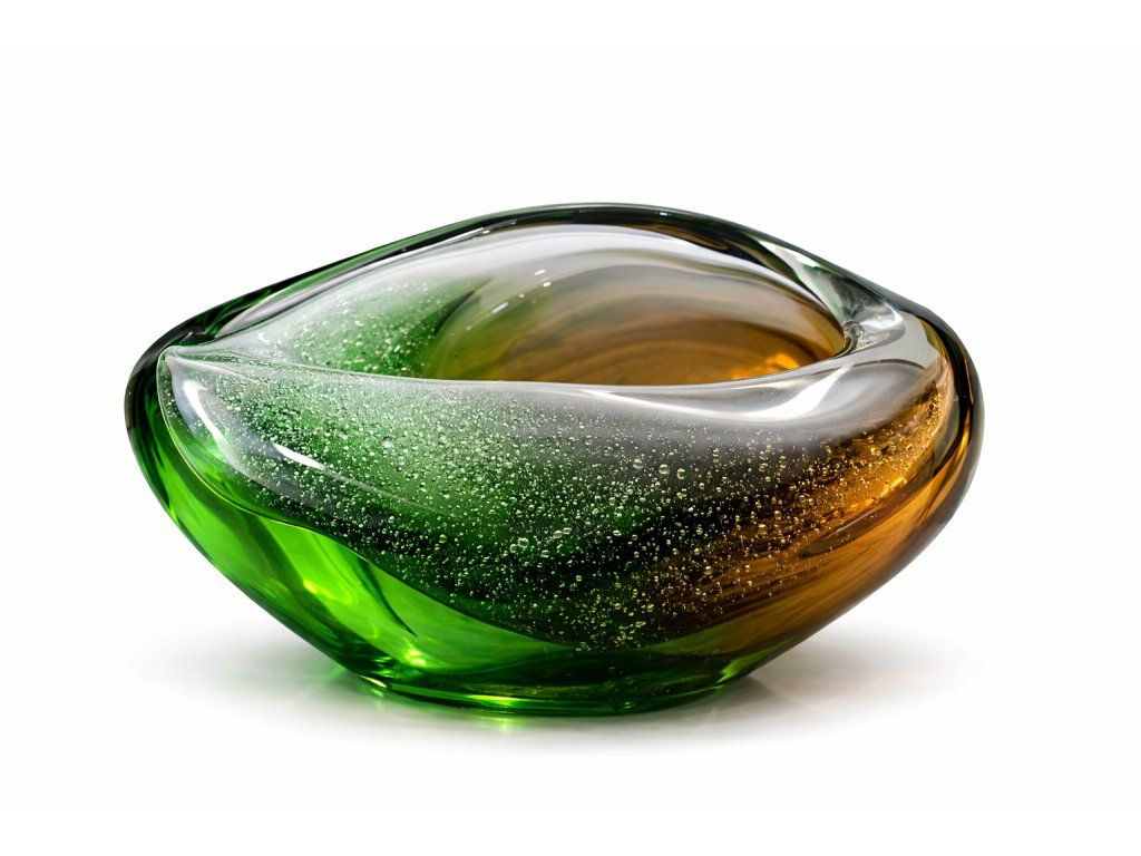 Krásný popelník z hutního skla dle autorského návrhu Františka Špinara, sklárna Škrdlovice, r. 1976. Výška 8 cm, délka 16 cm. Top sběratelský stav. V naší nabídce rovněž vzácný svícen ze stejné série.
