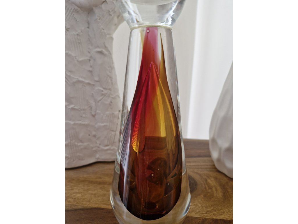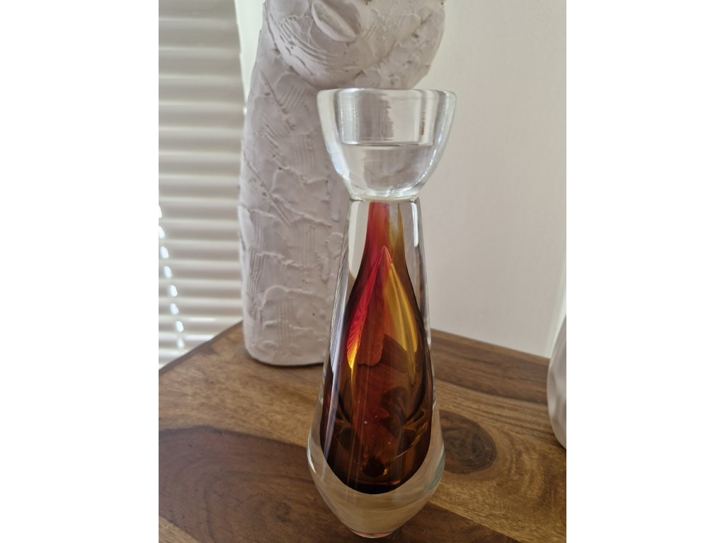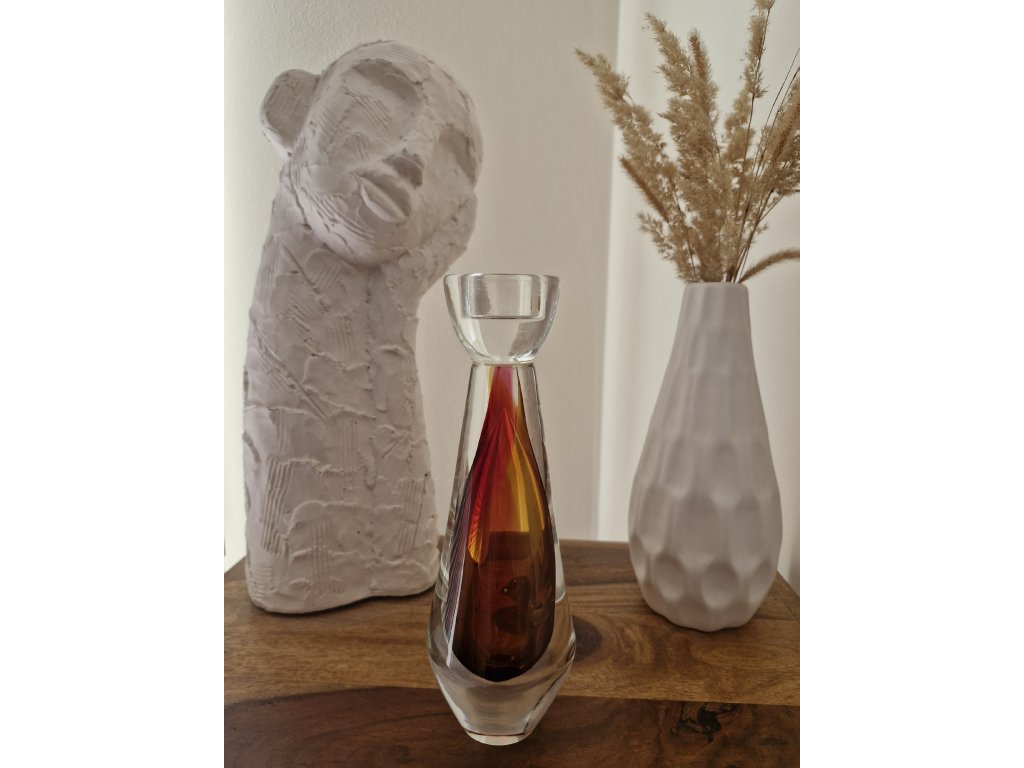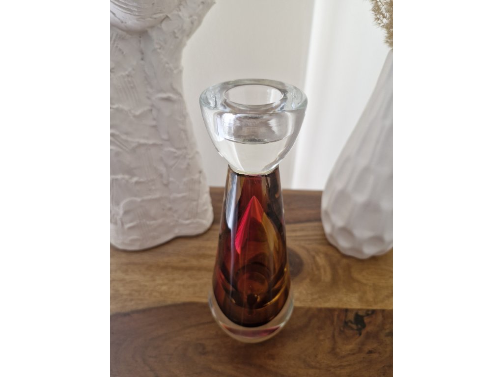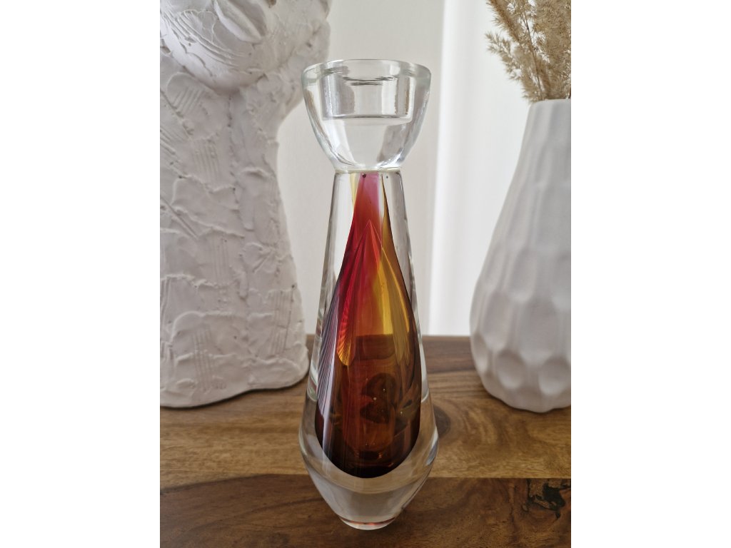 Krásný svícen z hutního skla s rubínovo - jantarovým jádrem. Z produkce sklárny Art Glass PRINC, Žďár nad Sázavou. Výška 24 cm. Top stav.