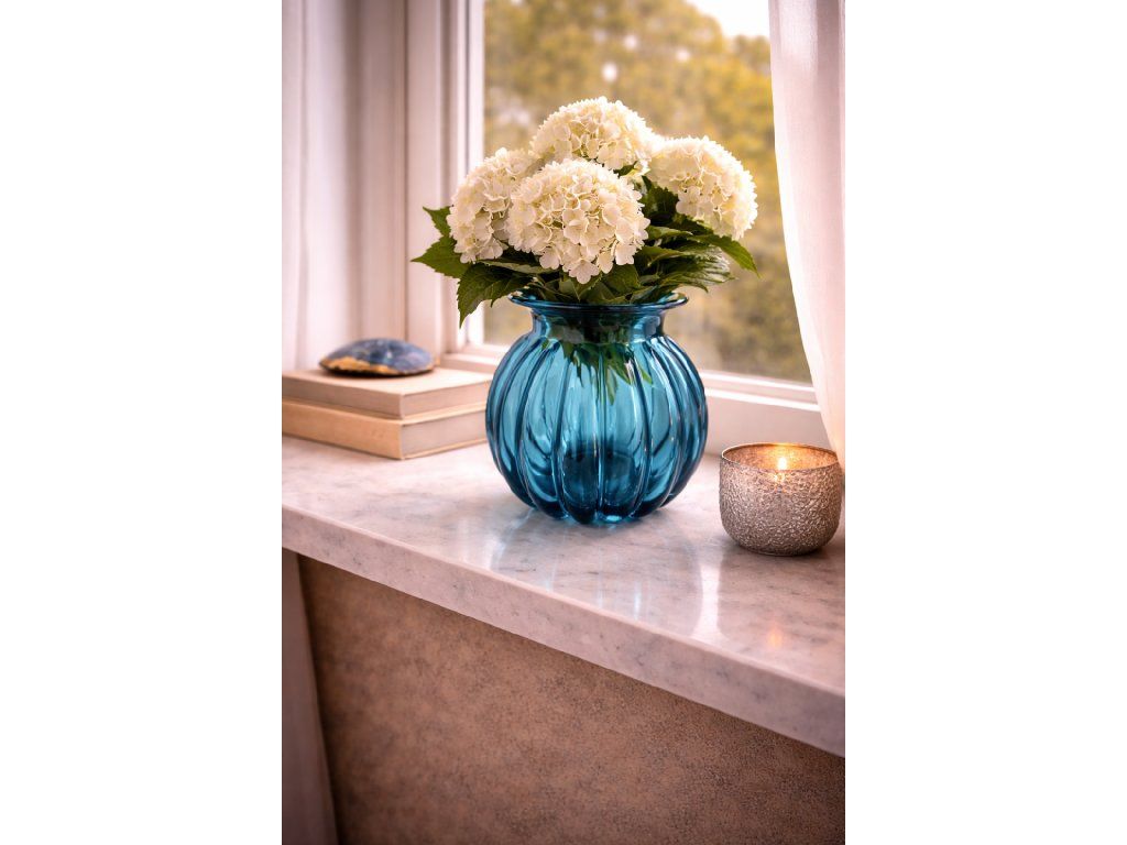 Nádherná tyrkysová ručně foukaná váza z bezolovnatého českého křišťálu. Autorský návrh Radua Kaňáková Zneikahová. Výška 23 cm, průměr 22 cm, průměr hrdla 14 cm. Top stav.