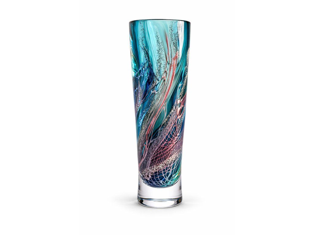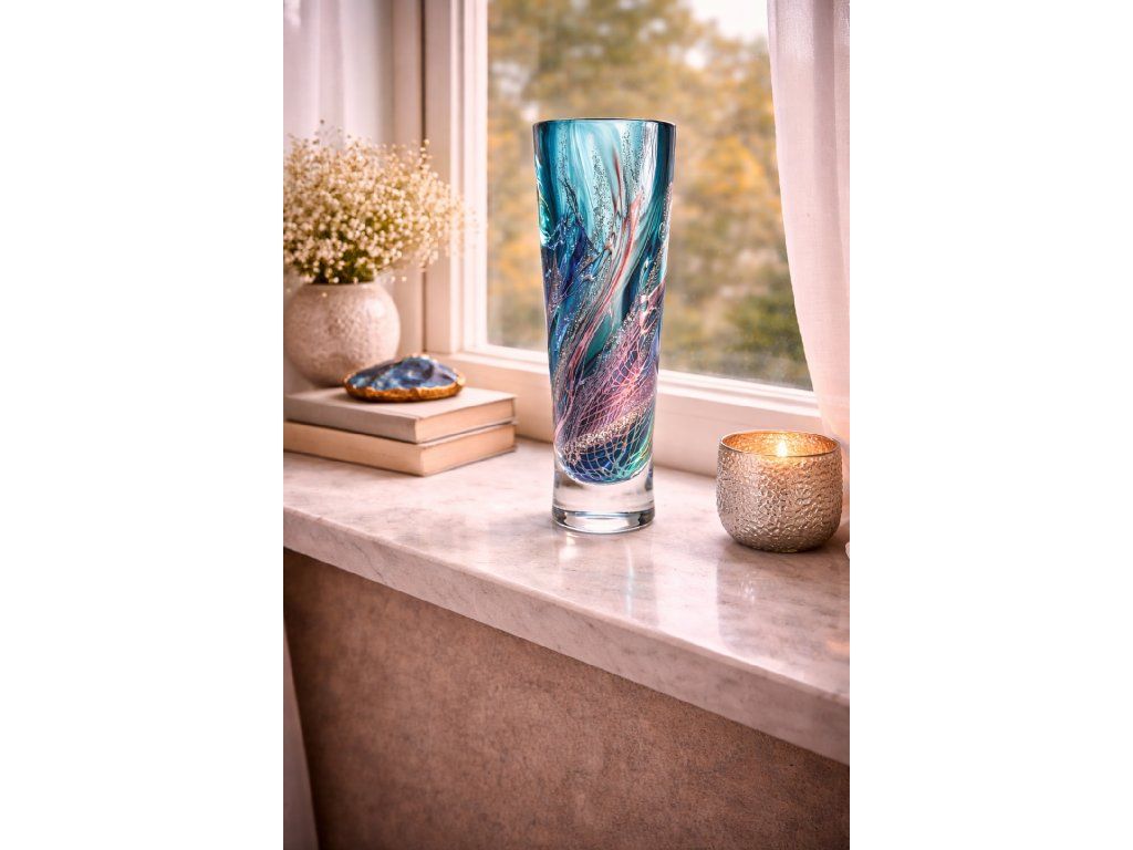 Váza z hutně tvarovaného skla s oblými tvary, ve skla byla použita kombinace sklářských barev a speciálního materiálu ve skle. Jedná se o autorskou práci sklářské dizajnérky Venduly Zámečníkové. Váza je signovaná a datovaná (2025). Výška 30 cm.